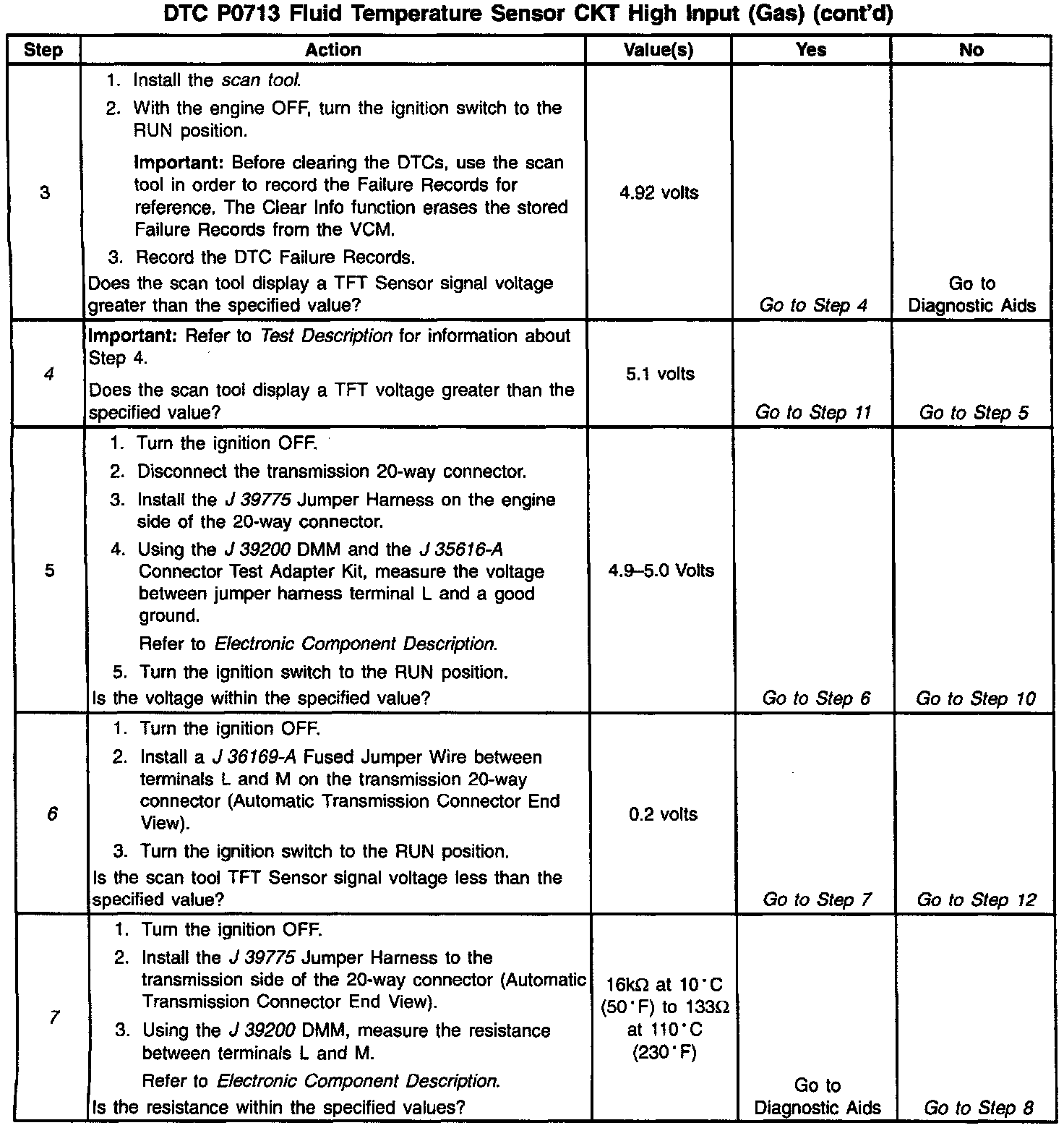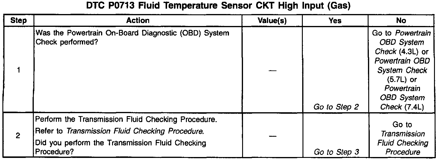 If the VCM detects a continuous open or short to the power in the TFT signal circuit or the TFT Sensor, then DTC P0713 sets. DTC P0713 is a type D DTC.