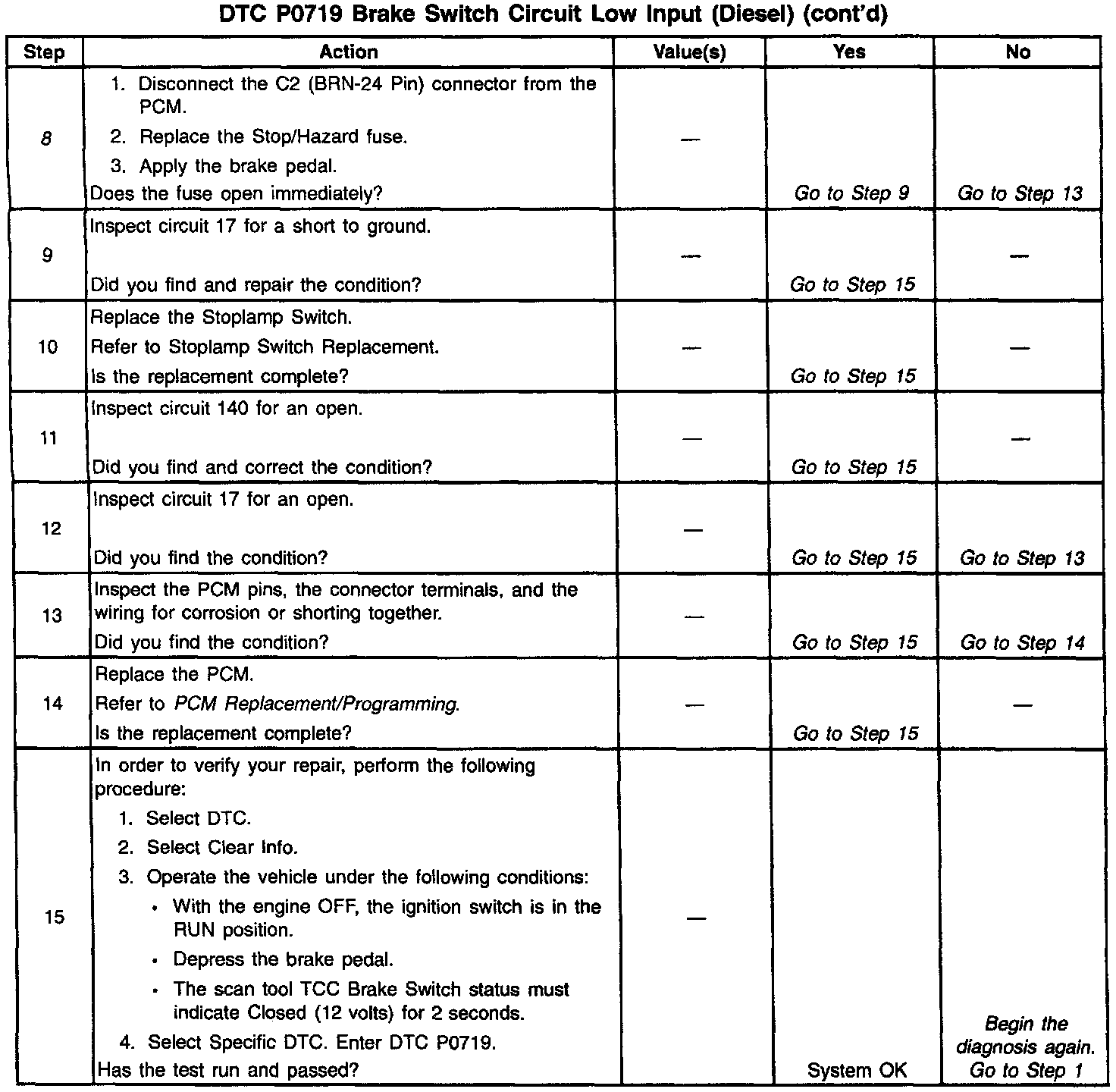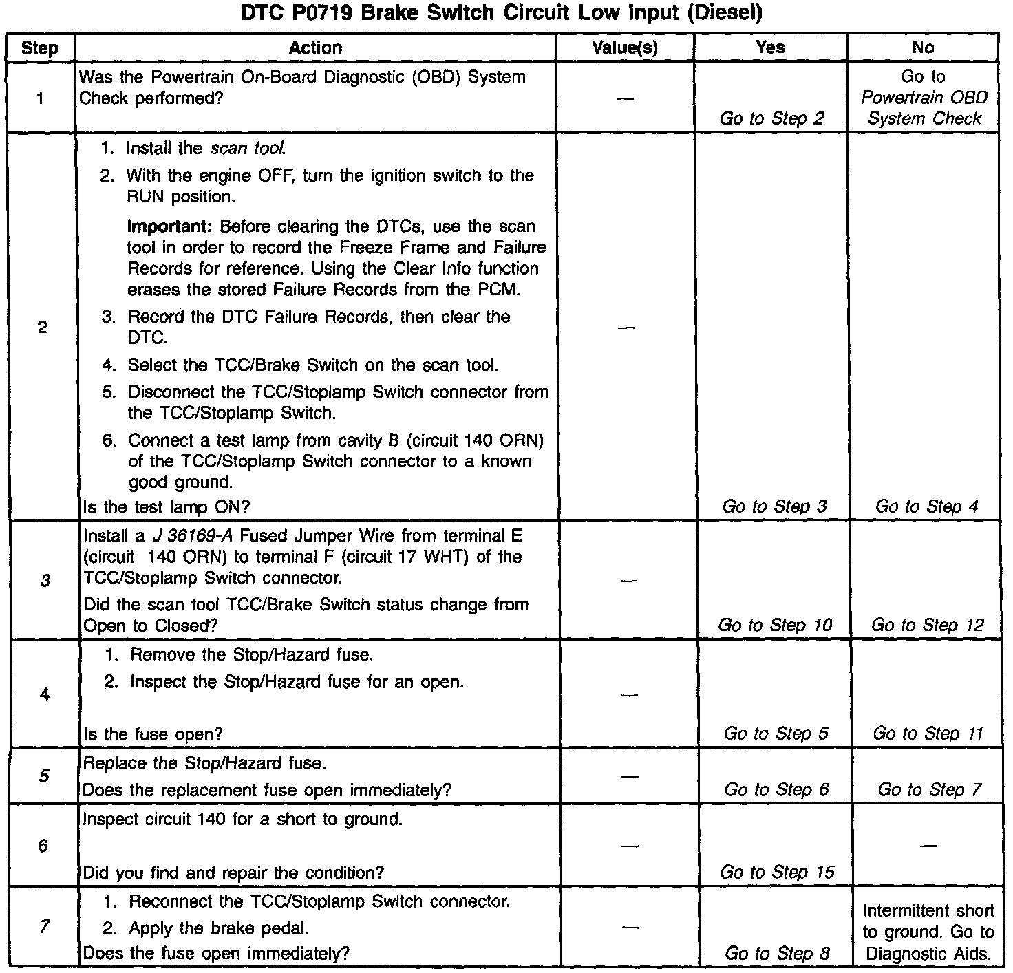 If the PCM detects an open TCC/Stoplamp Switch (stuck OFF) during decelerations, then DTC P0719 sets. DTC P0719 is a type D DTC.