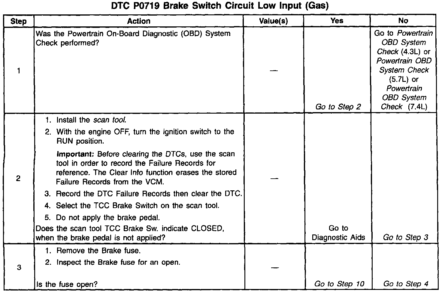 If the VCM detects an open TCC/Stoplamp Switch circuit during accelerations, then DTC P0719 sets. DTC P0719 is a type D DTC.