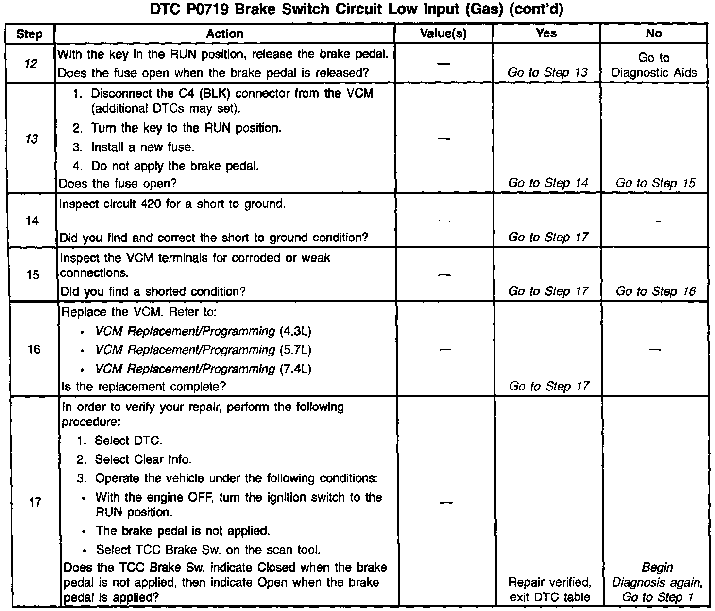 12. This step tests for a short to ground in circuit 420, from the TCC/Stoplamp switch to the VCM.