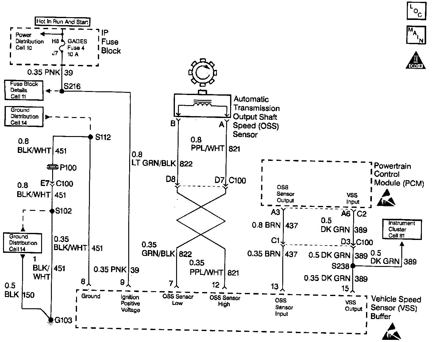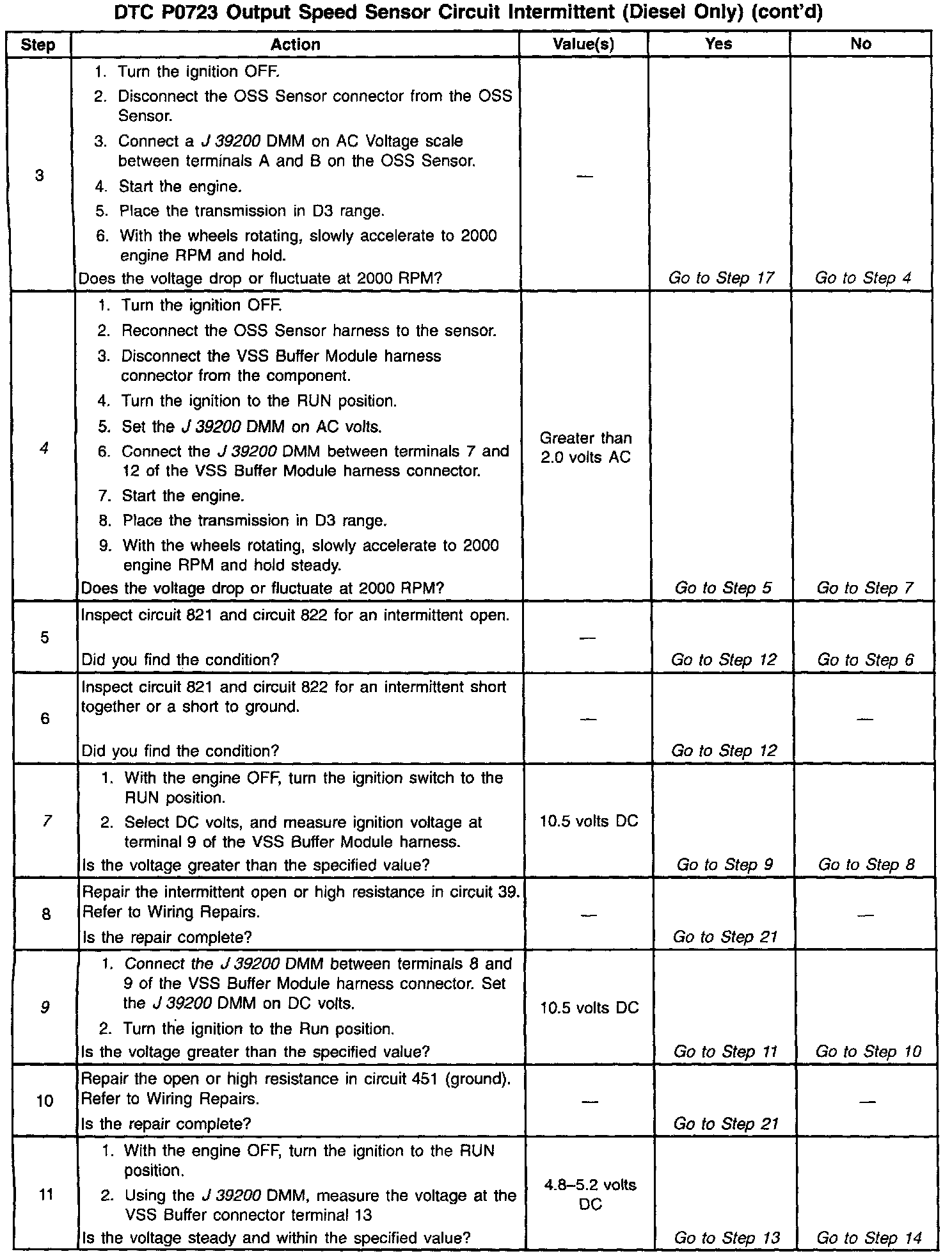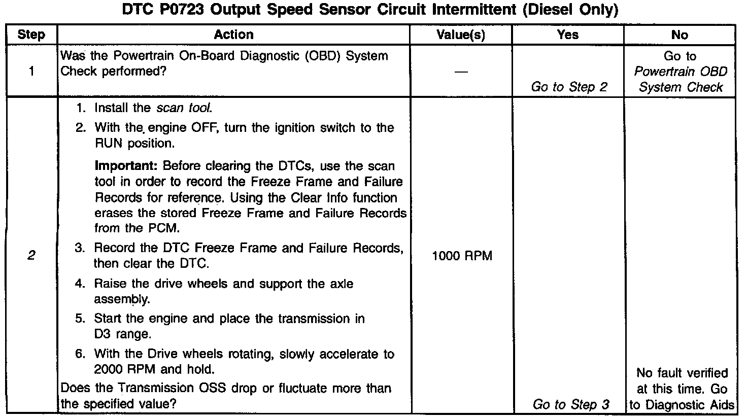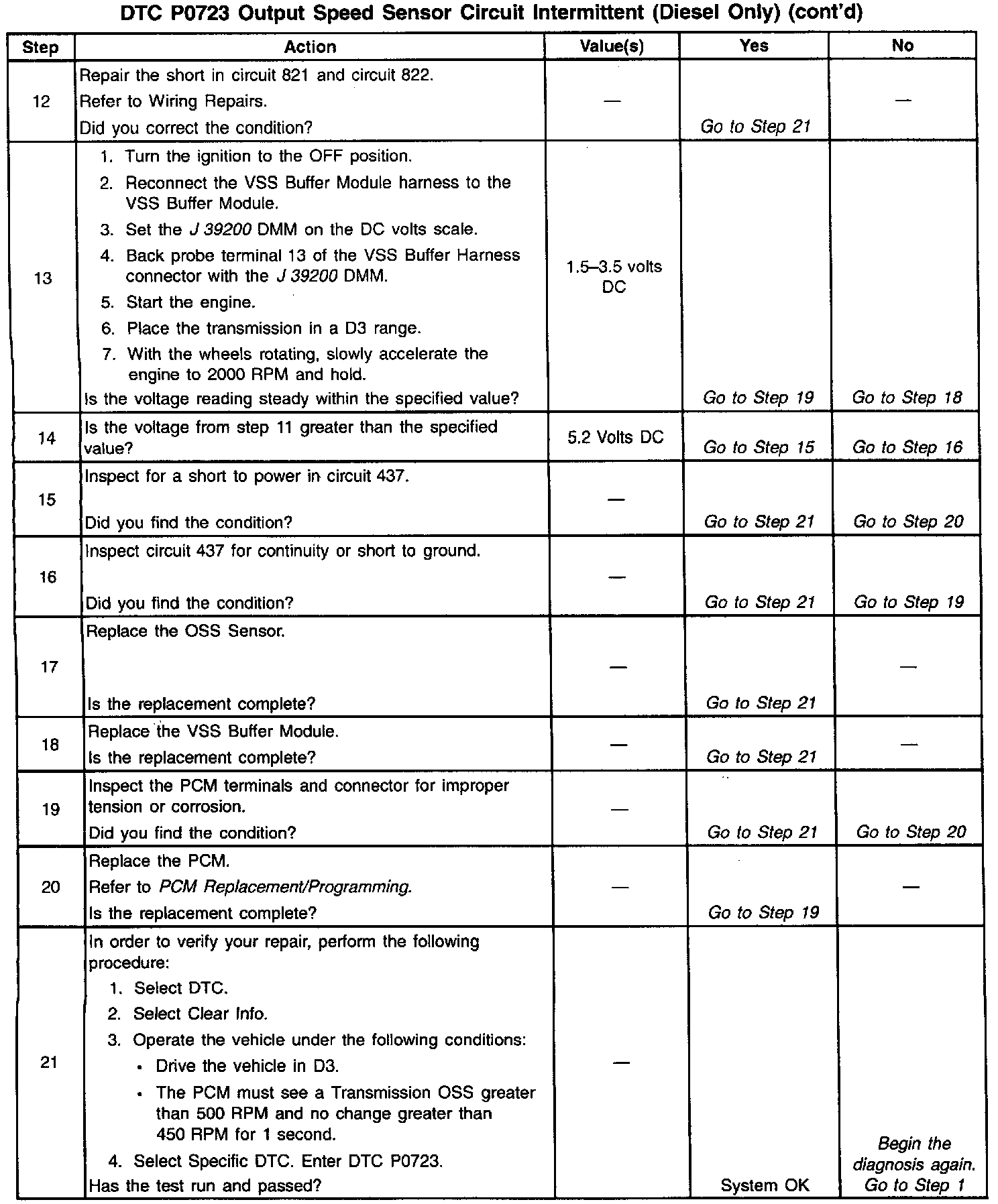 The speed sensor circuit consists of a magnetic induction type sensor, which is the Output Shaft Speed (OSS) Sensor, a Vehicle Speed Sensor (VSS) Buffer Module, and wiring. Gear teeth pressed onto the output shaft carrier assembly induce an alternating voltage into the sensor. This signal transmits to the VSS Buffer Module. The VSS Buffer Module compensates for various final drive ratios. The VS5 Buffer Module also convents the alternating current (AC) OSS signal into a 40 pulse per revolution (PPR) 5-volt DC square wave form signal on circuit 437 to indicate transmission output speed. If the PCM detects an unrealistically large change in the Output Shaft Speed (OSS) Sensor reading, then DTC P0723 sets. DTC P0723 is a type B DTC.