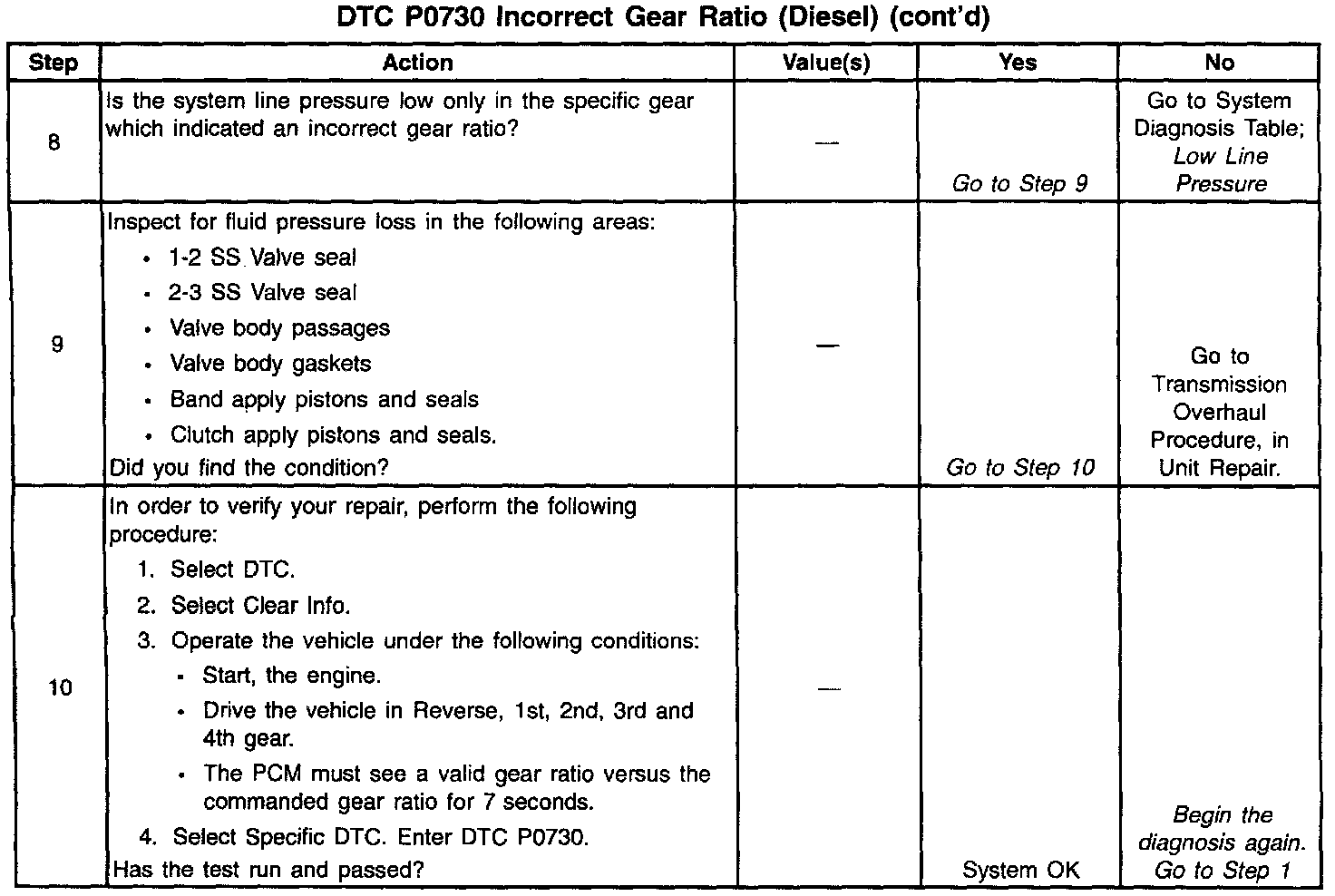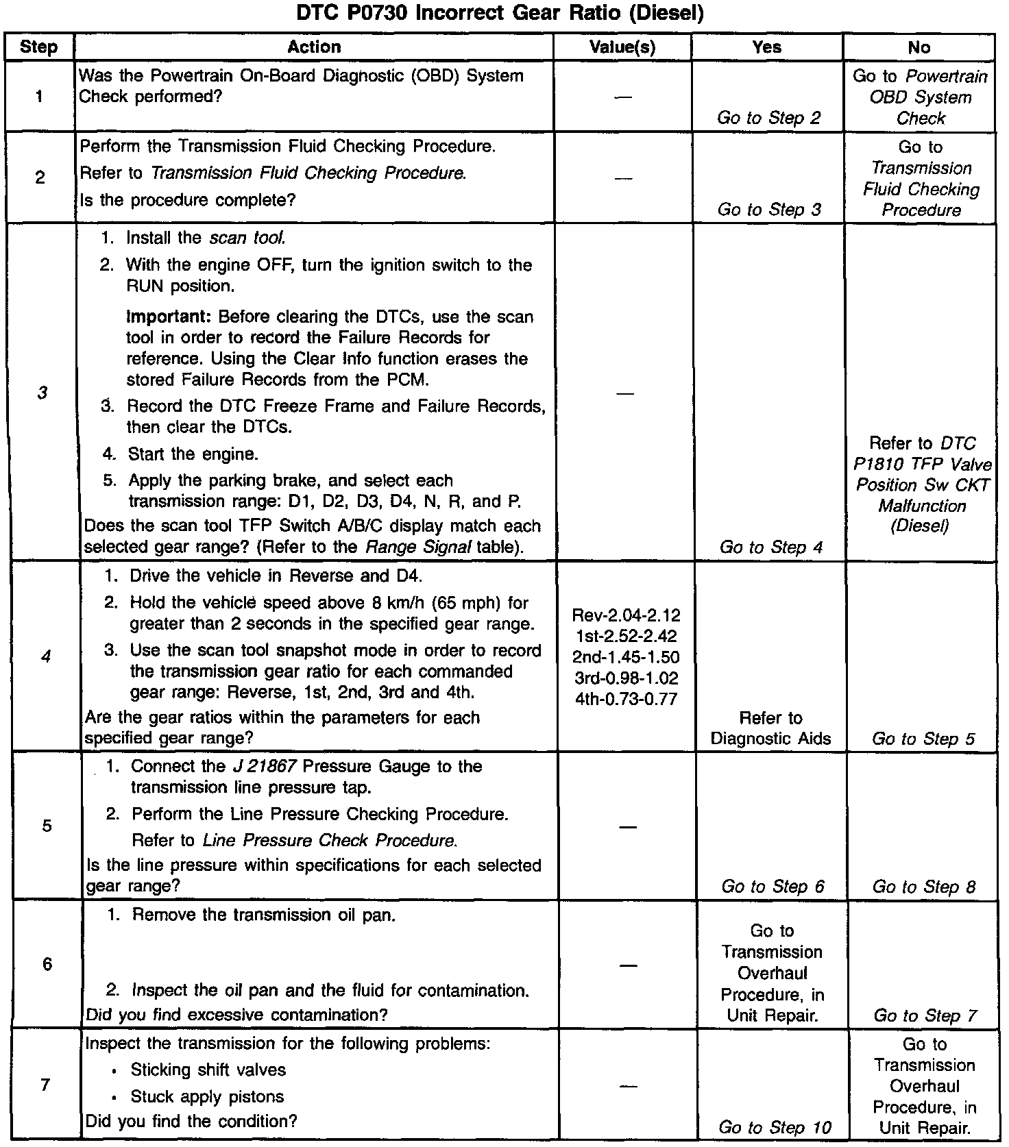 3. This step tests the indicated range signal to the actual selected range. A faulty TFP Val. Position Sw. could set DTC P0730.