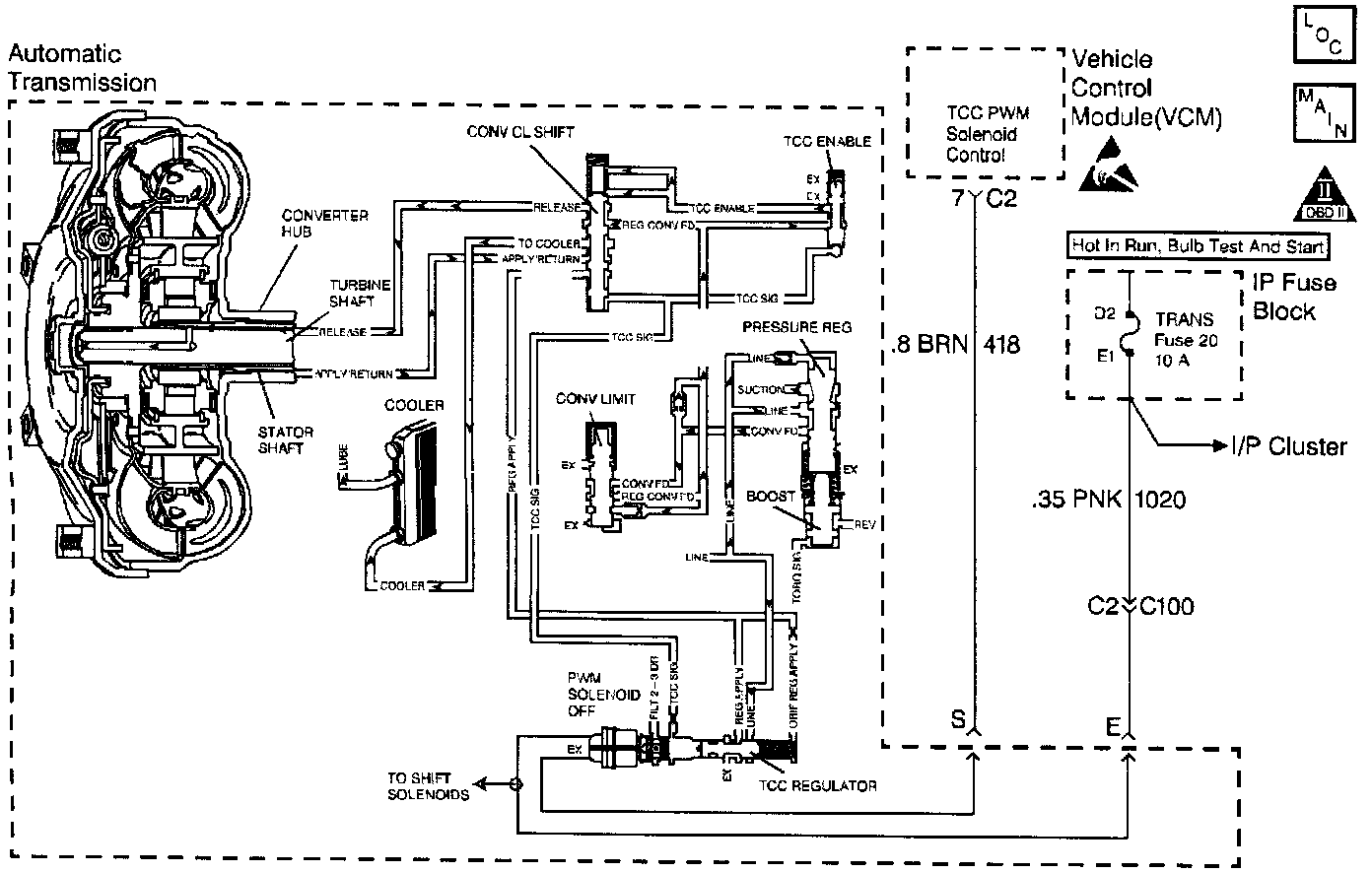 The TCC PWM Sol. Valve is de-energized by the VCM opening circuit 418. This action allows the TCC signal fluid to exhaust through the solenoid and blocks filtered 2-3 drive fluid from entering the TCC signal circuit. The loss of fluid pressure in the TCC signal circuit releases the TCC.