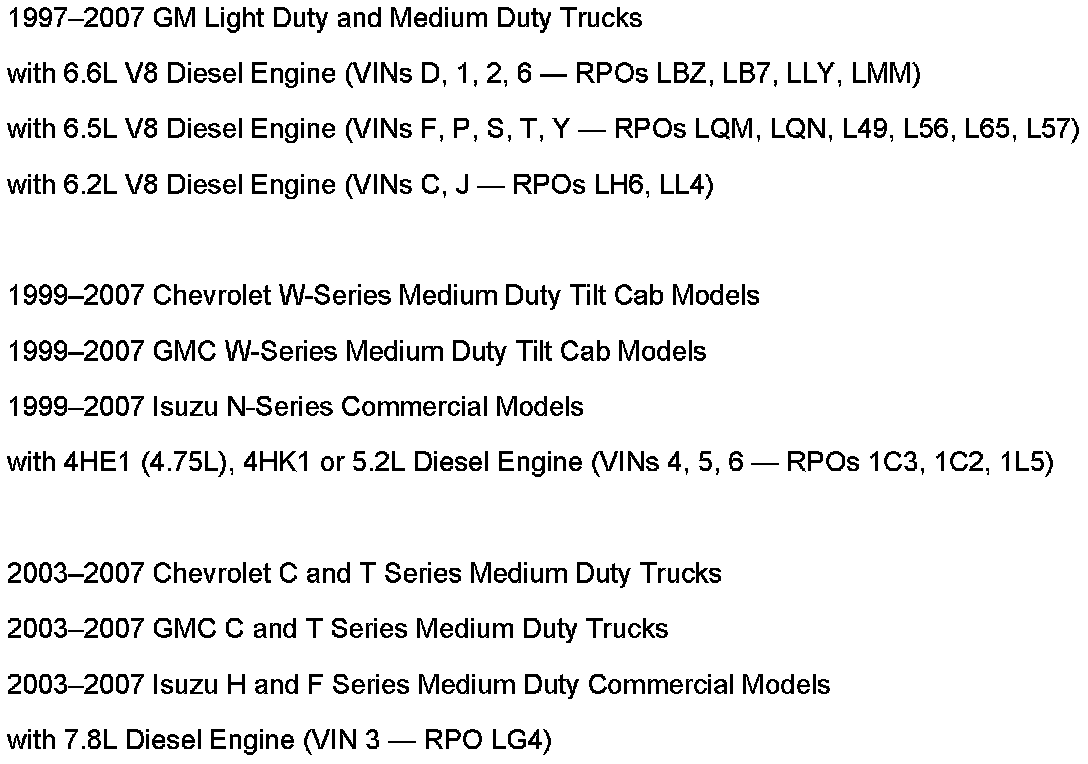 All other Light and Medium Duty 6.2L, 6.5L, and 6.6L RPO codes LB7, LBZ, and LLY diesel engines (including 2007 model year LBZ and LLY) can use either the LSF (low sulfur diesel) or ULSF (ultra low sulfur) diesel fuels.