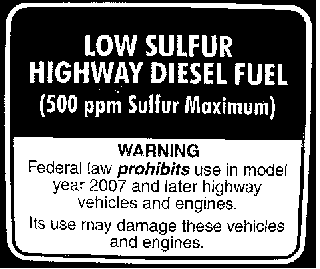 Some fuel companies may be putting warning labels on their diesel fuel pumps. The warning labels will describe the sulfur content of the fuel. It will also advise customers not to use a 500 ppm sulfur fuel in a 2007 or later vehicle. Refer to the graphic illustration above.