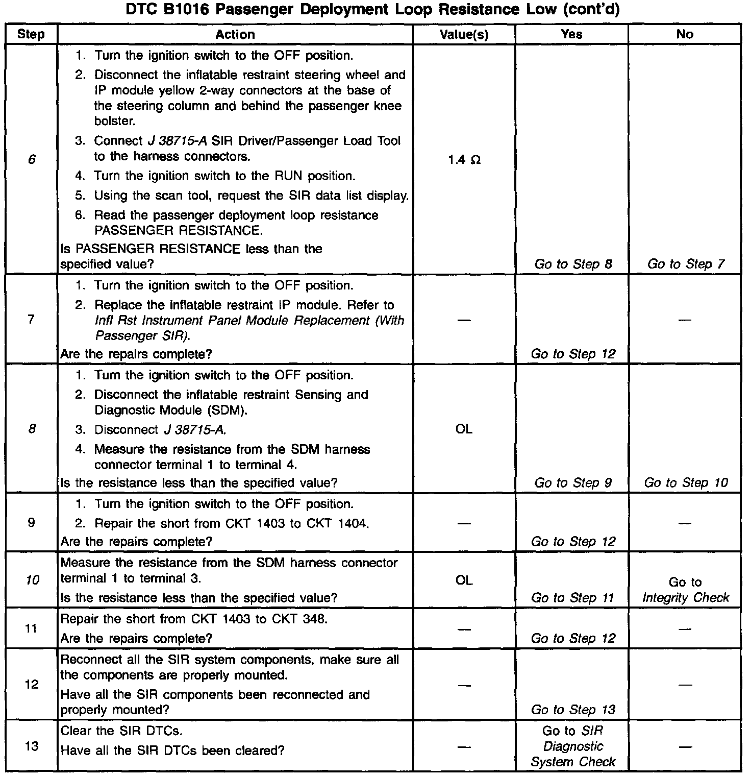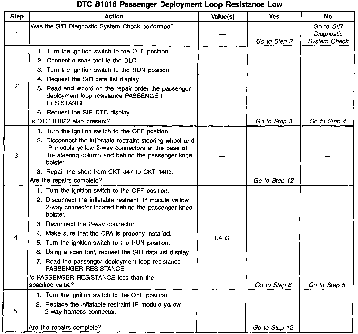 The resistance of the passenger deployment loop is more than 1.4 ohm and the ignition switch is cycled.