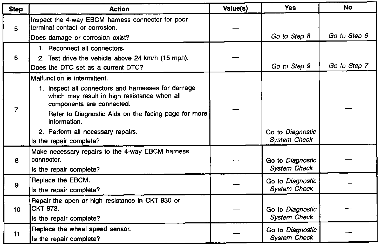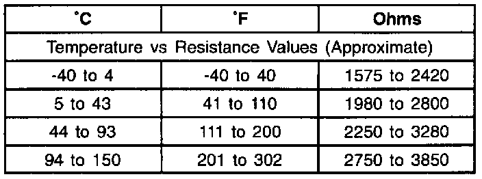 Resistance of the wheel speed sensor will increase with an increase in sensor temperature. Refer to the table for temperature/resistance values.