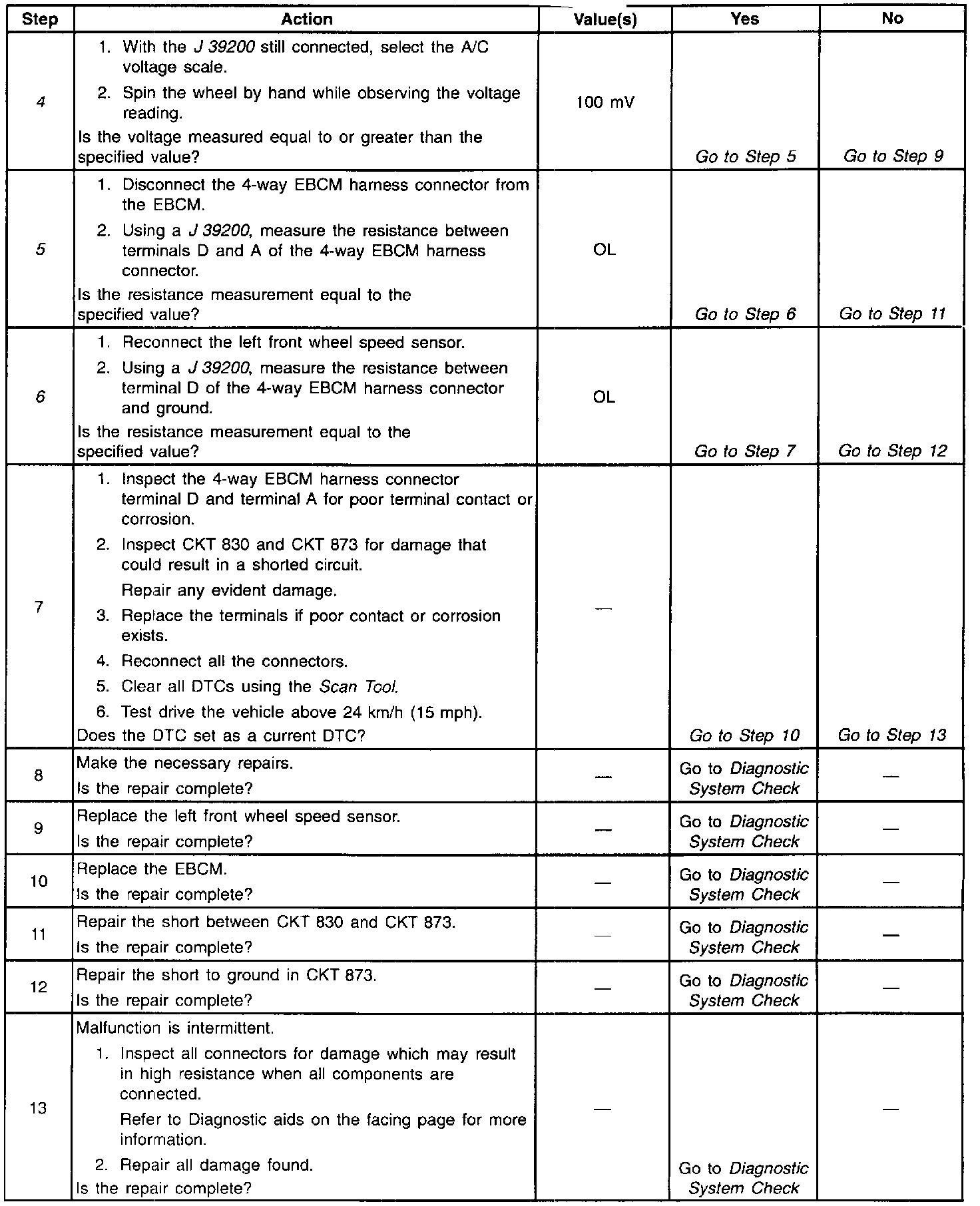 6. This step checks for a short to ground in the loft front wheel speed sensor circuit.