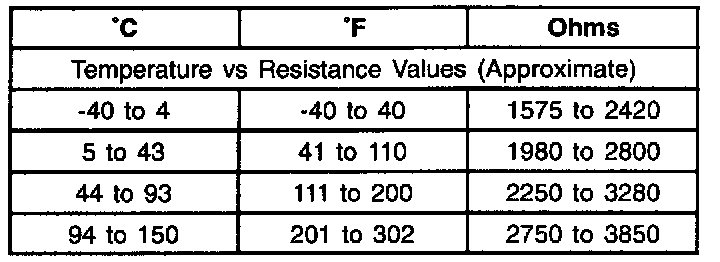 Resistance of the wheel speed sensor will increase with an increase in sensor temperature. Refer to the table for temperature/resistance values.