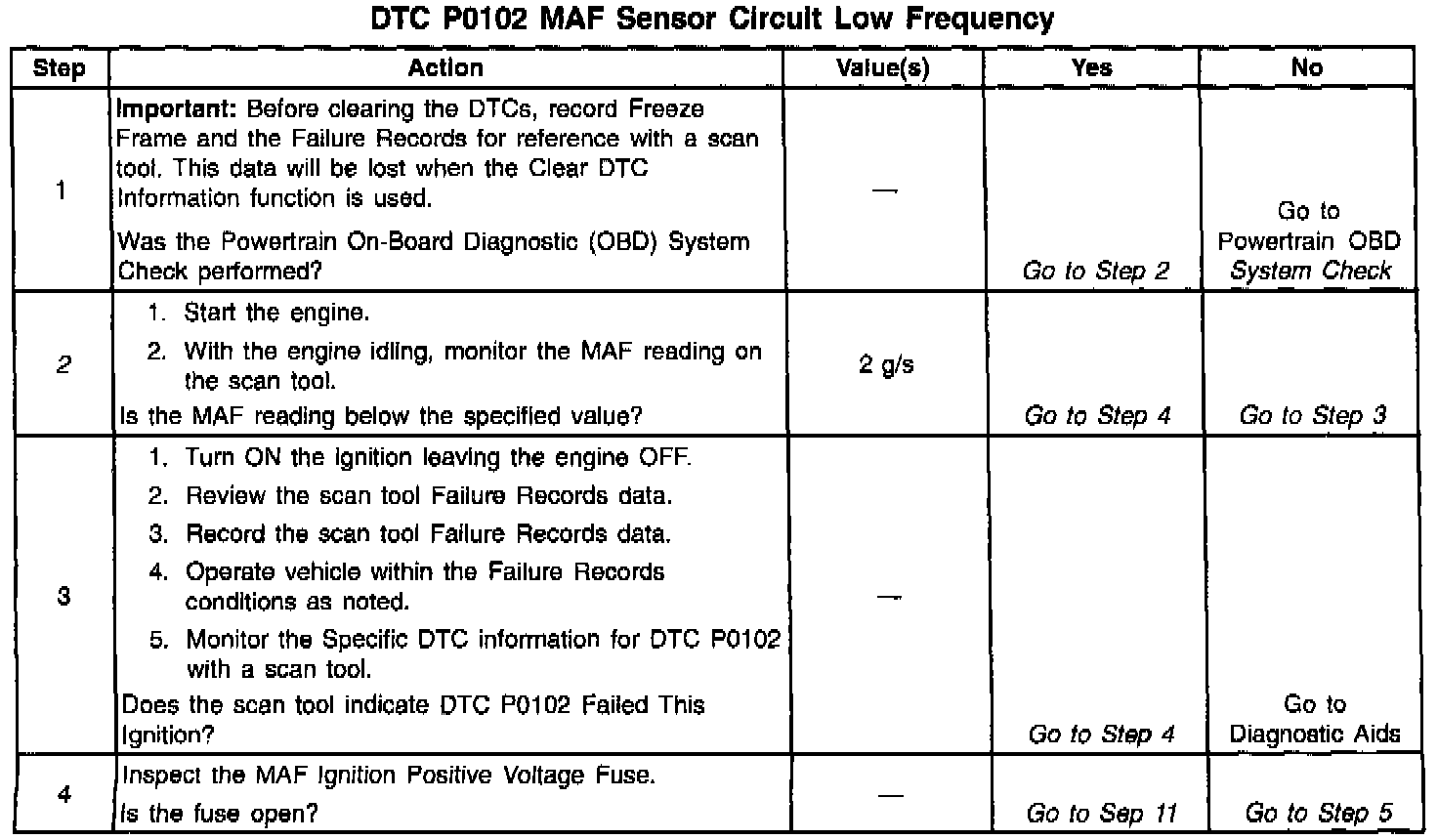 The MAF sensor produces a frequency signal which can be monitored with a scan tool. The frequency varies within a range of around 5 to 7 g/s at idle to near 125 g/s at maximum engine load.