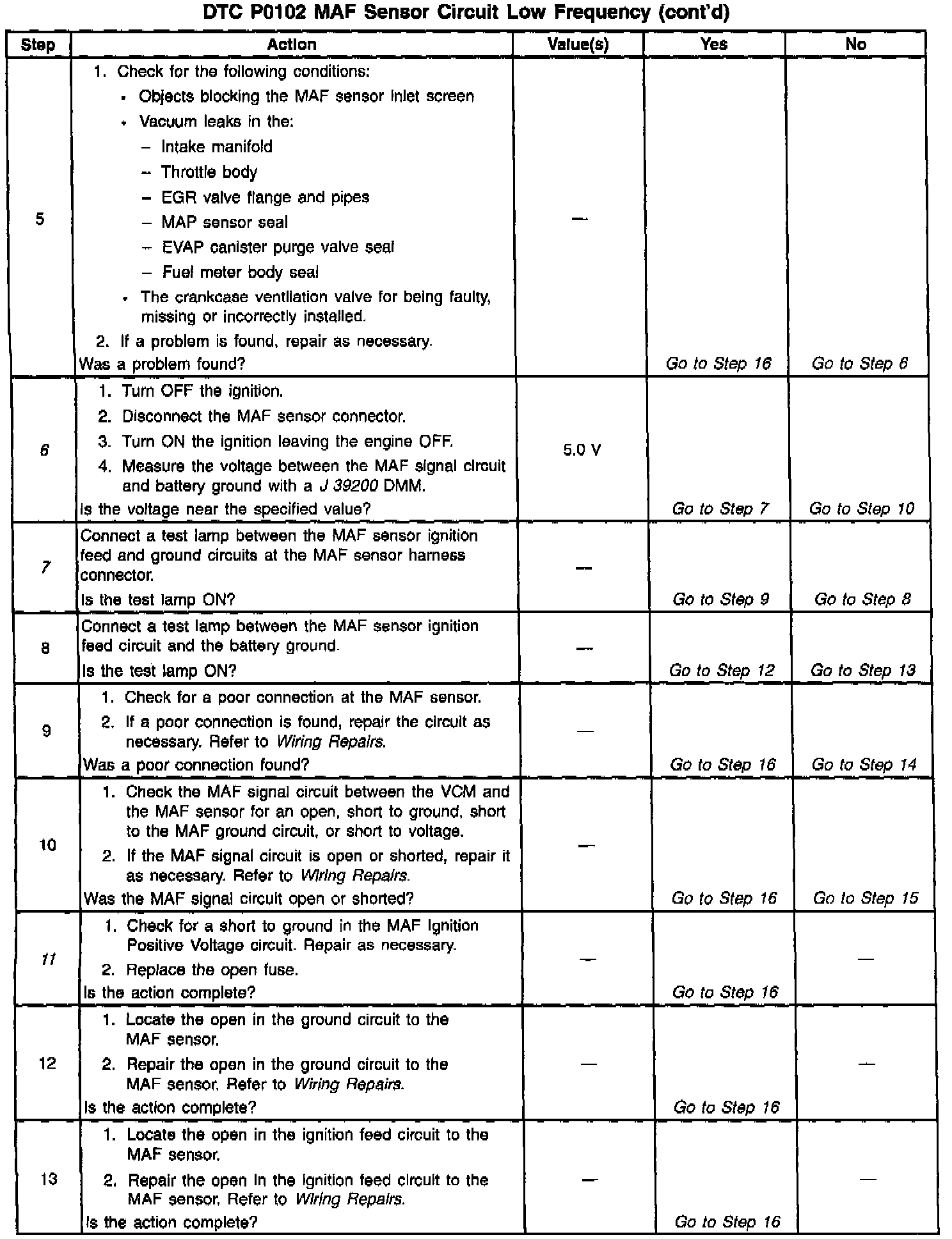 6. A voltage reading of less than 4 or over 6 volts at the MAF sensor signal circuit indicates a fault in the wiring or a poor connection