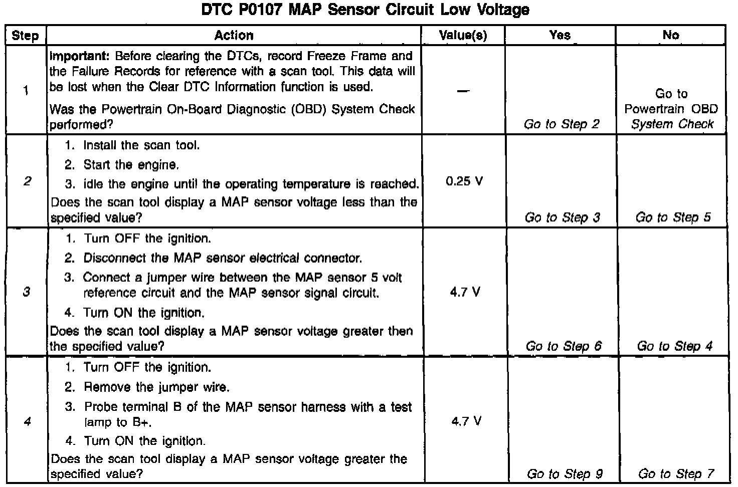 4. The scan tool may not display 5 volts. The important thing is that the VCM recognized the voltage as more than 4 volts, indicating that the VCM and MAP signal circuit are OK.