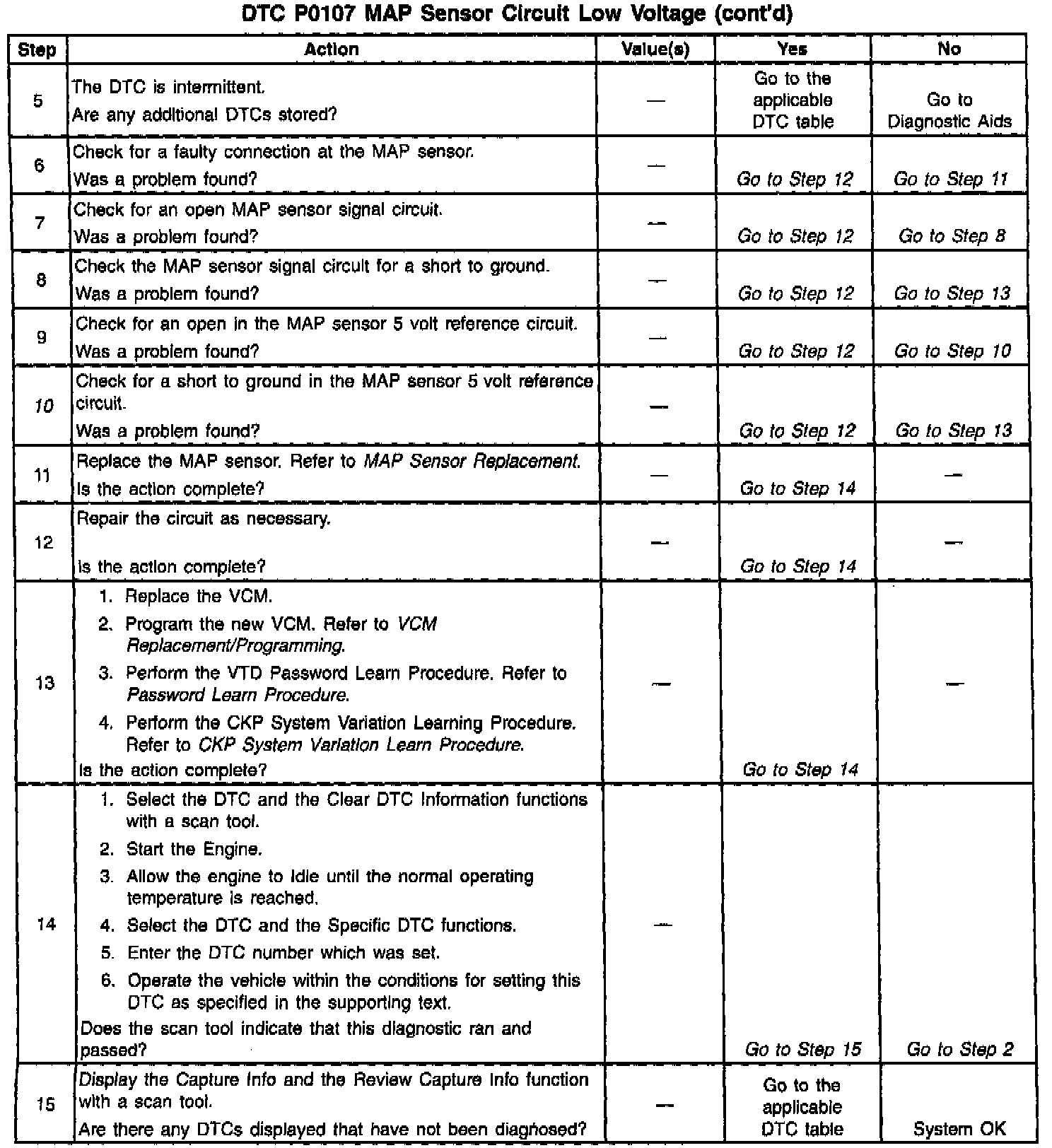 The numbers below refer to the step numbers on the diagnostic table.