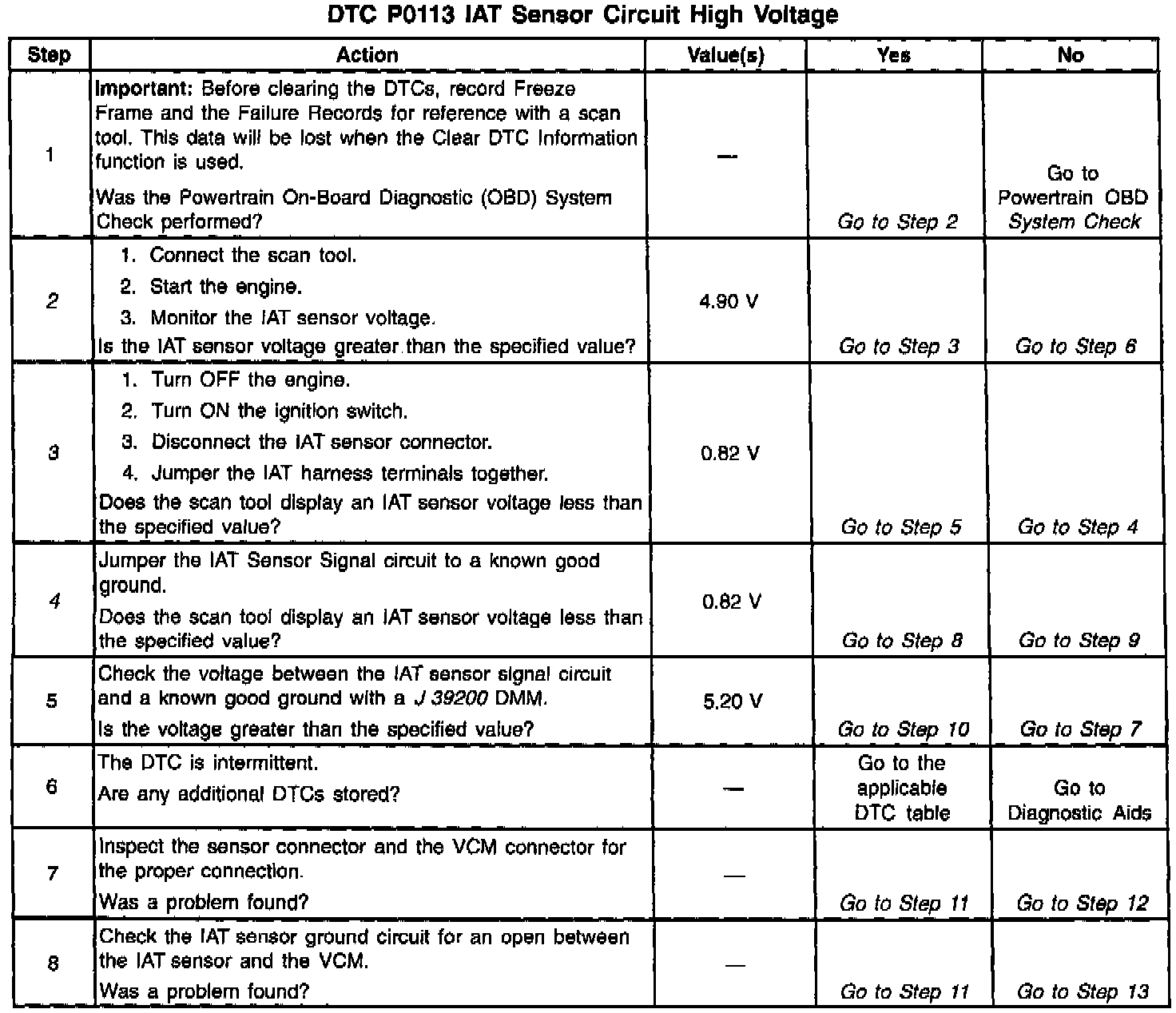 A scan tool indicates the temperature of the ambient air which is entering the throttle body. The air temperature should read very close to the temperature of the outside air. The air temperature should rise gradually as the engine warms up and the underhood temperature increases. If DTC P1111 is set, the problem is intermittent. Check for an open in the IAT sensor circuit. This may be accomplished by moving the VCM harness at various locations and monitoring IAT temperature or IAT voltage on the scan tool. If the voltage varies, look for an open in the area of the harness that caused the variance Also, a sensor may become skewed or mis-scaled. The Temperature vs. Resistance Value Table will help in order to detect a skewed sensor. Refer to Specifications / Electrical / Temperature vs Resistance.