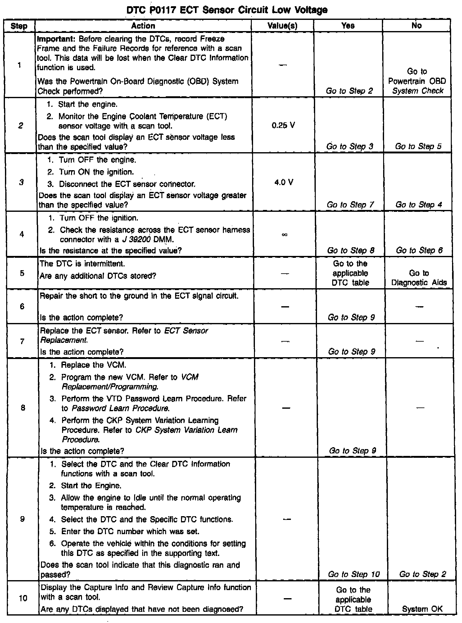 Use the Temperature vs. Resistance Value Table to test the coolant sensor at various temperature levels in order to evaluate the possibility of a skewed (mis-scaled) sensor. A skewed sensor could result in poor driveability concerns. Refer to Specifications / Electrical / Temperature vs Resistance.