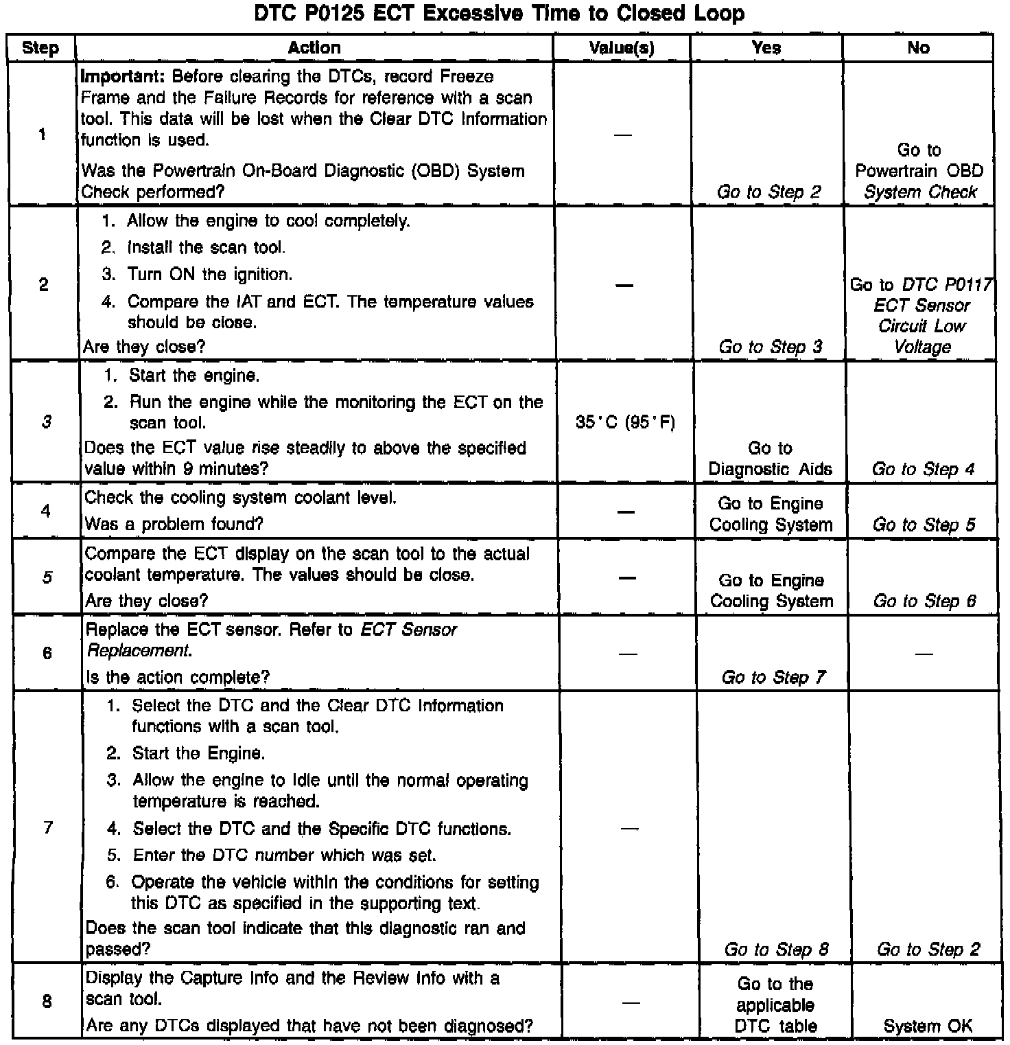 When a DTC P0125 sets, a skewed ECT sensor or the engine thermostat that does not operate correctly is indicated.