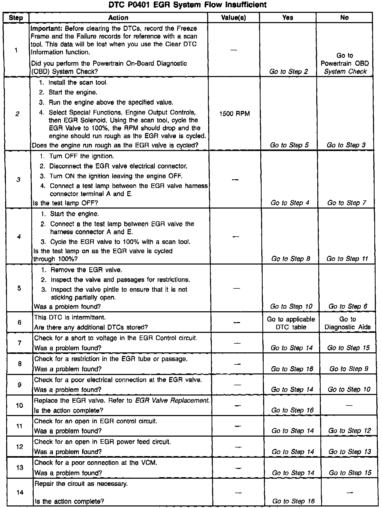 The VCM tests the EGR system during deceleration by momentarily commanding the EGR valve open. The pressure in the intake manifold increases when the EGR valve is open. The VCM monitors the Manifold Absolute Pressure (MAP) sensor signal during the EGR system diagnostic in order to determine the amount of EGR flow. The VCM calculates an error based on the difference between the actual MAP increase and a predetermined value. The VCM records the error and adjusts an internal fail counter towards the fail threshold if the error is too great. The VCM sets a DTC P0401 when the fail counter exceeds the fail threshold. The number of test samples required to exceed the fail threshold varies according to the magnitude of the detected flow errors.