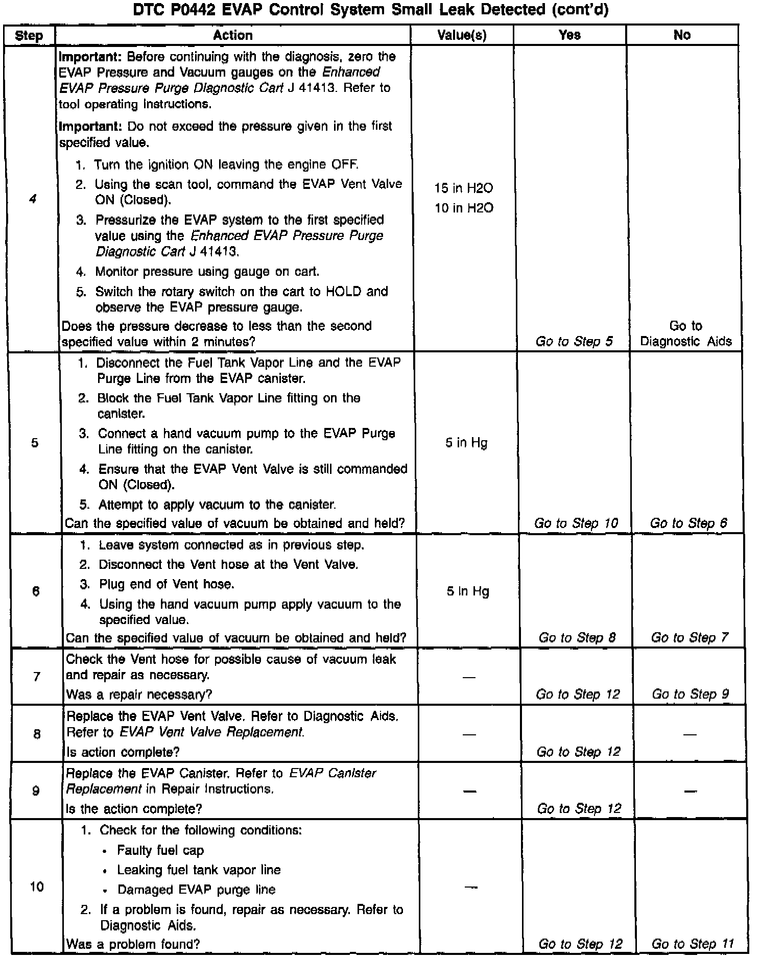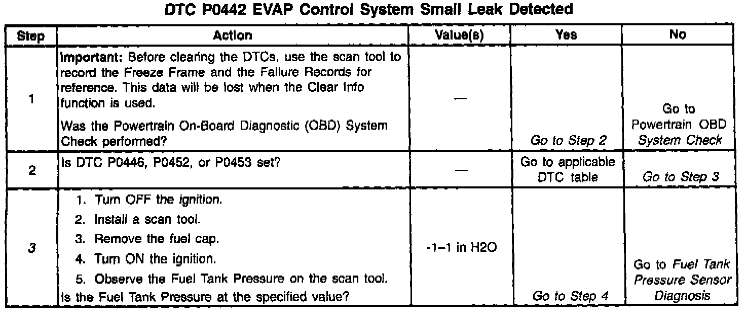 The evaporative leak detection diagnostic strategy is based on applying a vacuum to the EVAP system and monitoring the vacuum decay rate. The VCM monitors vacuum level via the fuel tank vacuum sensor input. At an appropriate time, the EVAP purge solenoid and the EVAP vent solenoid are turned ON, allowing the engine vacuum to draw a small vacuum on the entire evaporative emission system. After the desired vacuum level has been achieved, the EVAP purge solenoid turns OFF, sealing the system. A leak is detected by monitoring for a decrease in the vacuum level over a given time period. A small leak in the system will cause DTC P0442 to be set.