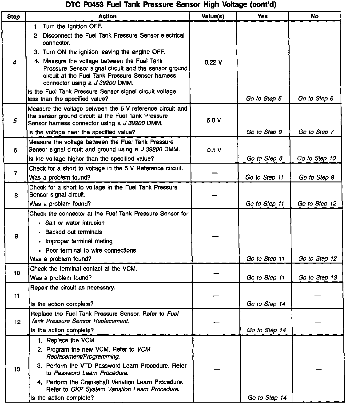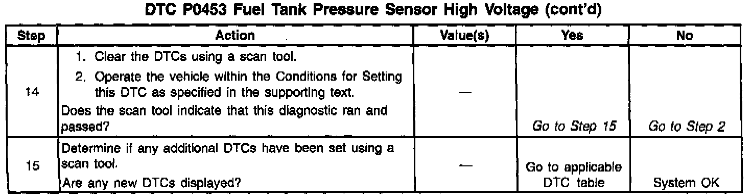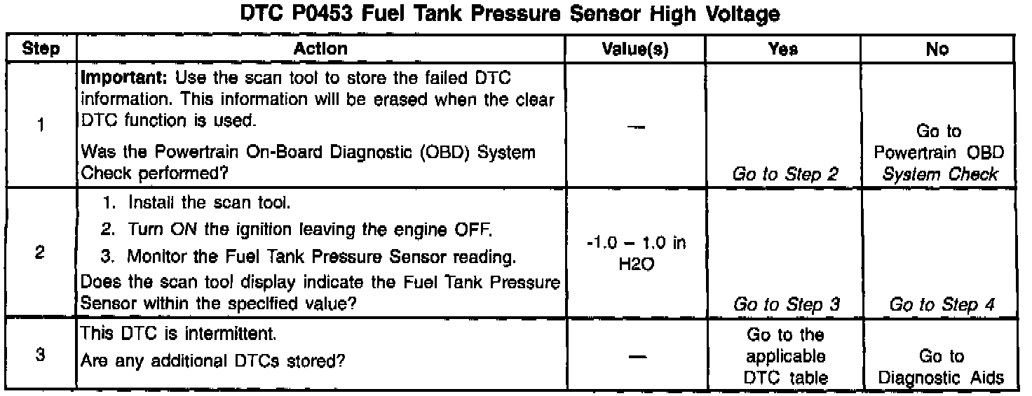 The Fuel Tank Pressure Sensor diagnosis table is intended to isolate and diagnose the electrical problems with the sensor wiring or the sensor.