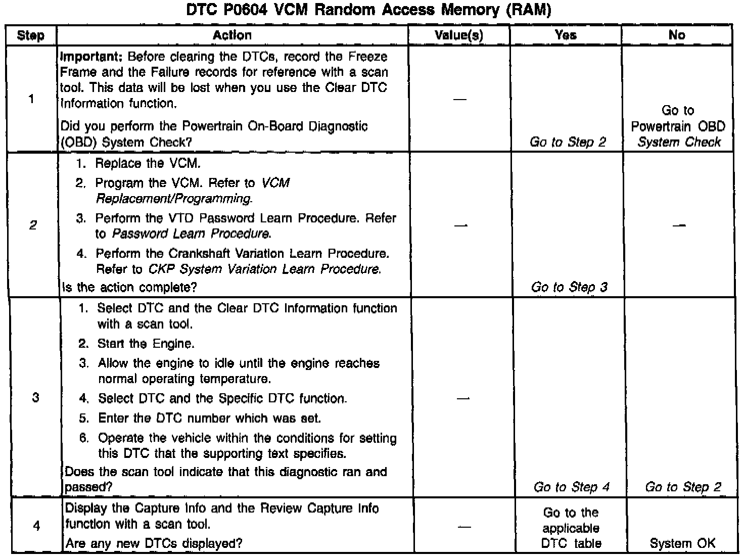 The VCM, contains a memory area where it stores certain data it does not needs to save when the ignition is turned OFF. This area is called the Volatile section of memory. The Volatile section of memory is cleared and then tested when the ignition is first turned ON. This diagnostic test monitors the VCMs Volatile section of memory to make sure it is stored correctly. If the information is not stored correctly, DTC P0604 will set.