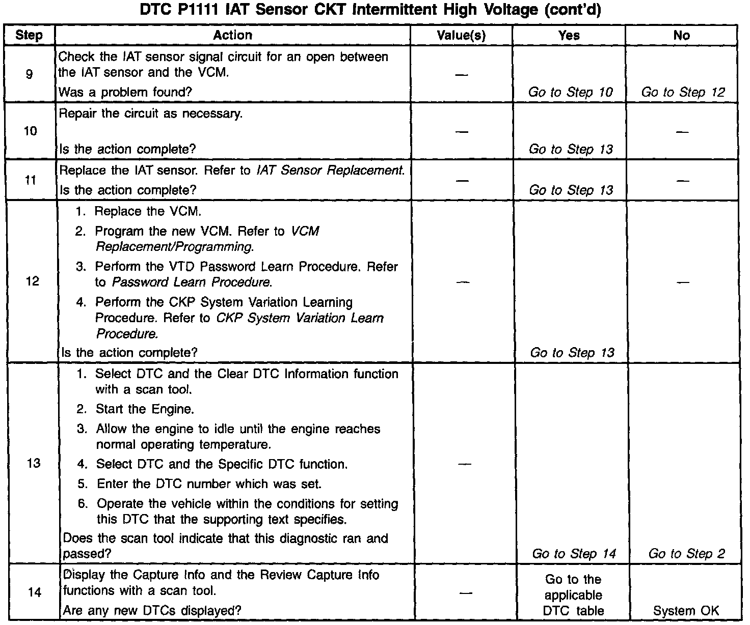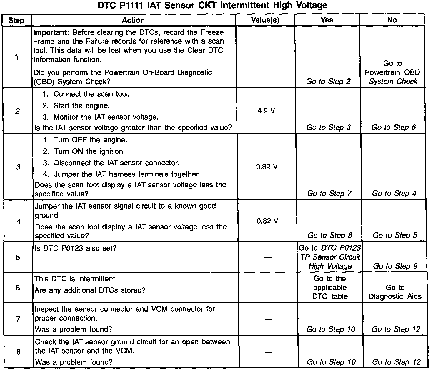 A scan tool indicates the temperature of the ambient air entering the throttle body. The air temperature should read very close to the temperature of the outside air. The air temperature should rise gradually as the engine warms up and the underhood temperature increases. If the DTC P1111 is set, the problem is intermittent. Check for poor connections at the VCM and IAT sensor by wiggling the connector gently and monitoring the IAT temperature or IAT voltage on the scan tool. If the voltage waivers, repair the connector that caused the waiver. Also, a sensor may become skewed or mis-scaled. The Temperature vs. Resistance Value Table will help to detect a skewed sensor. Refer to Specifications / Electrical / Temperature vs Resistance.