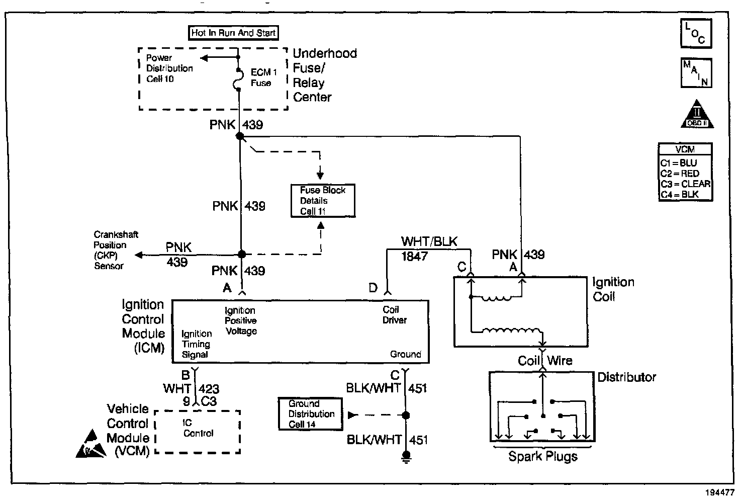 Once the VCM calculates the ignition timing, the ignition coil module on the IC circuit receives the timing signal. Each timing pulse received by the ignition coil module on the IC circuit triggers the coil module in order to operate the ignition coil. The secondary ignition voltage is induced, and then the secondary ignition voltage is sent to the distributor for distribution to each spark plug.