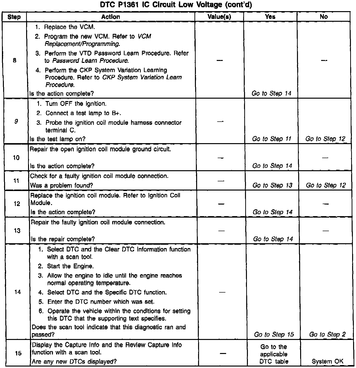 9. The remaining tests begins to check that the ignition coil module circuitry is OK. If the ignition coil module loses its voltage source, the secondary voltage will not be produced, and a DTC P1361 will set.