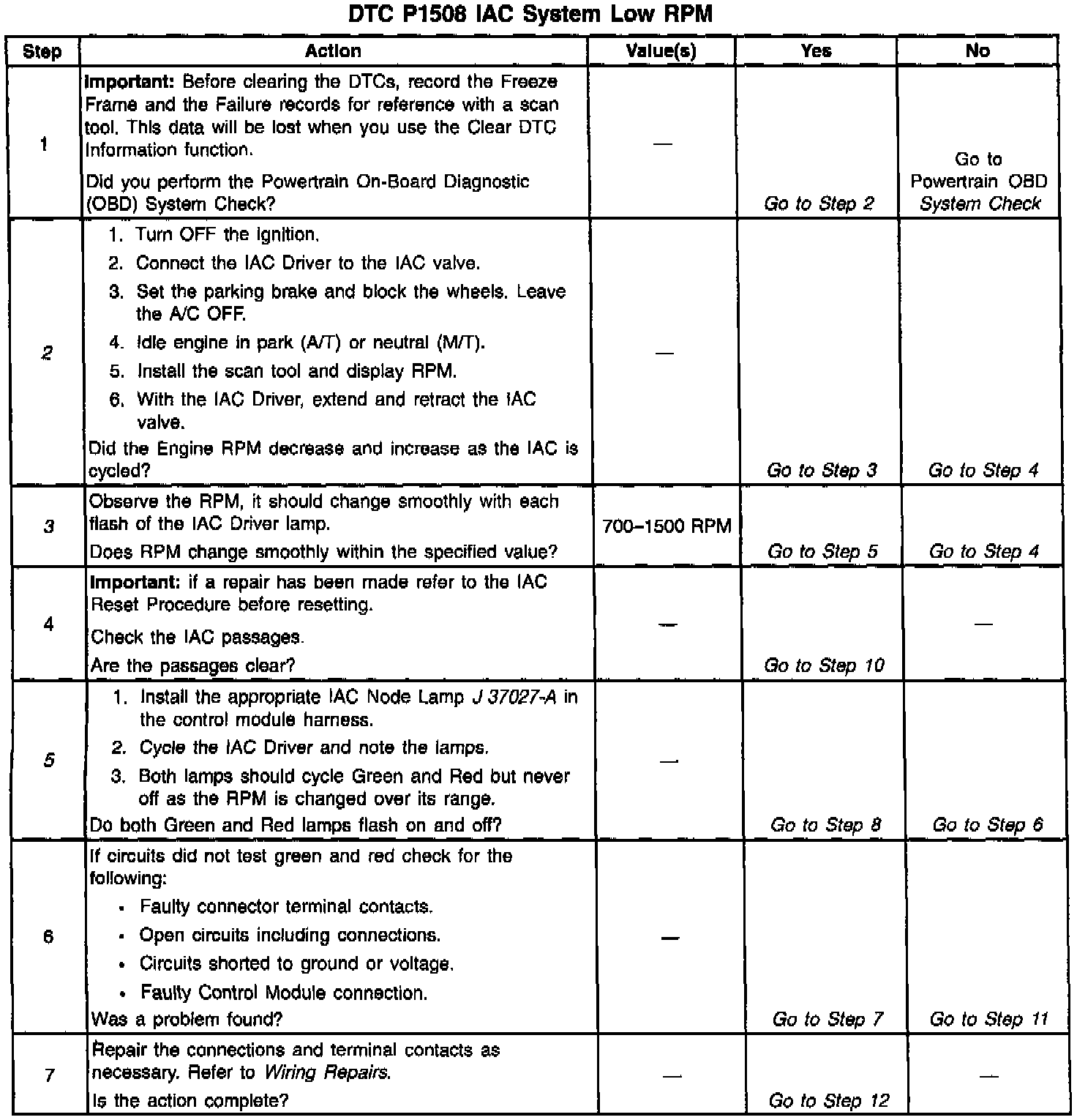 3. This step checks the quality of the IAC movement in step 2. Between 700-1200 RPM, the engine speed should change smoothly with each flash of the tester lamp in both extend and retract. If the IAC valve is retracted beyond the control range (about 1500 RPM), it may take many flashes in the extend position before engine speed will begin to drop. This is normal on certain engines, fully extending IAC may cause engine stall. This may be normal.