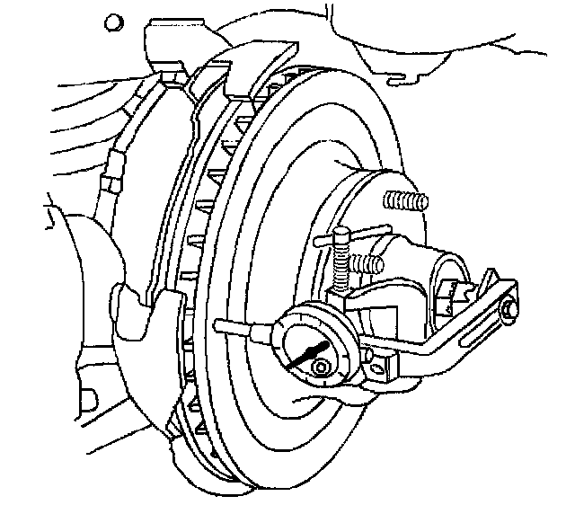 Leave the wheels on the vehicle when performing a lateral runout check in order to obtain the most accurate reading of the Total Indicated Runout (TIR) under real breaking conditions. If equipment is not available to perform the check with the wheels installed, then remove the wheels leaving the caliper in place.