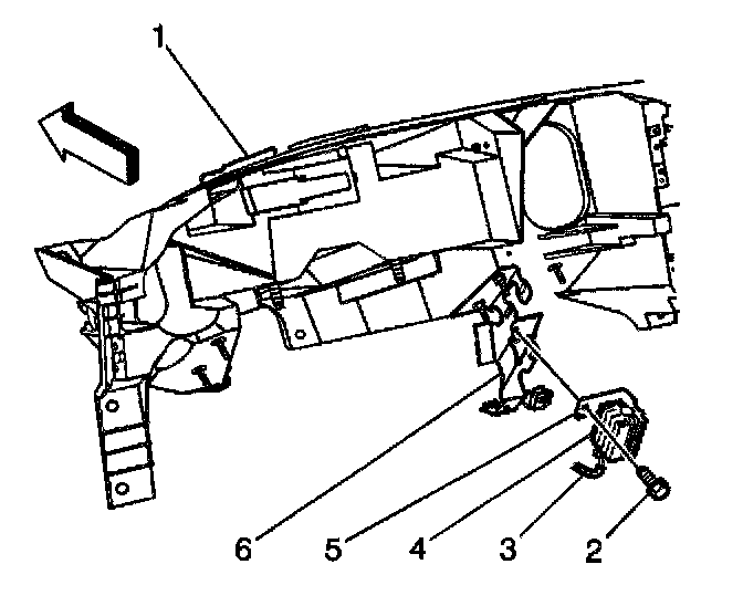 2. Remove the bolt (2) that retains the DRL diode to the left inside knee bolster bracket (6).