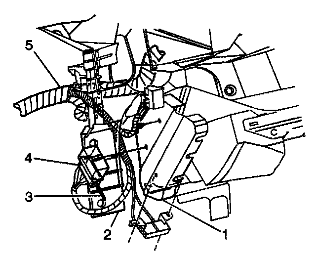 1. Install the DRL module (4) to the left outside knee bolster bracket (1).