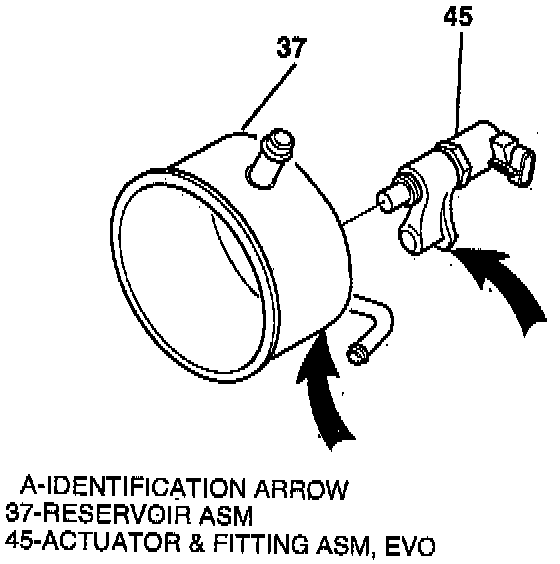 ^ For correct orientation, align the Variable Assist Steering actuator discharge fitting with the mark on the pump reservoir.