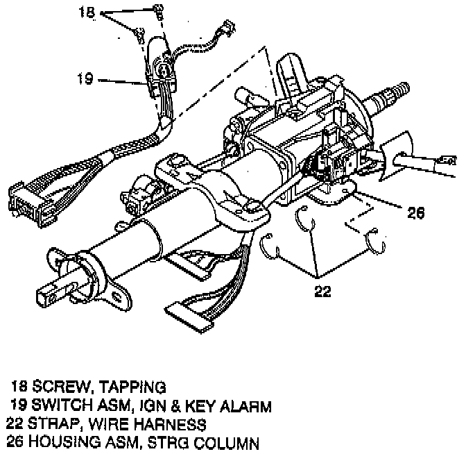 ^ Route wire harness through slot in steering column housing assembly (26). Secure wire harness with a wire harness strap (22) through hole located in the bottom of housing assembly (26).