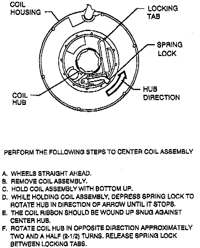 2) Centering spring is pushed down, letting hub rotate while coil (2) is removed from steering column. (If this occurs, refer to the figure to center coil)