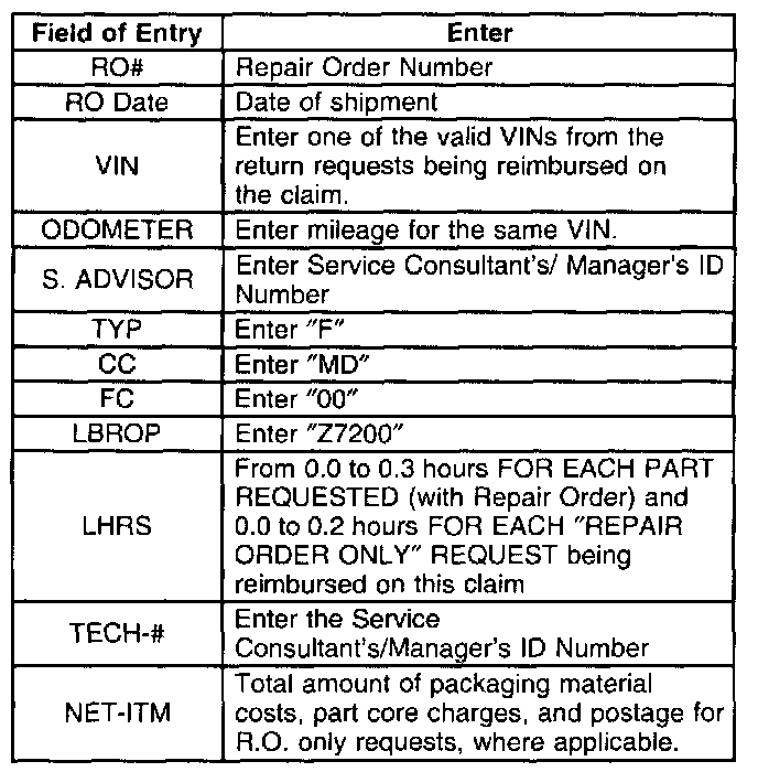 When submitting a single return request for reimbursement, use the normal submission procedures and Labor Operation Z7200 with claim type "F." In order to receive reimbursement for multiple part return requests, choose one of the VINs for the one line claim. Submit for the total of all corresponding charges (up to 10 requests) on that one line. Refer to the description of claim submission entries shown. All related documentation, including a copy of the CPR return request, must be retained for future reference in accordance with the GM Service Policies & Procedures Manual.
