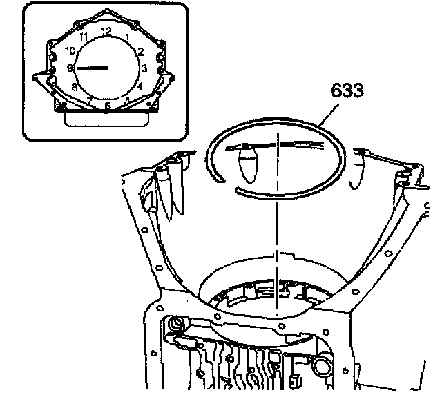 4. Install the center support retaining ring (633) using J28585. The end gap should be located at the nine o'clock position with the beveled edge of the snap ring facing up.