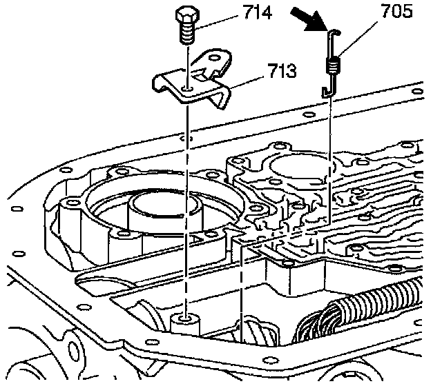 4. Remove the parking pawl bracket (713) and bolt (714).