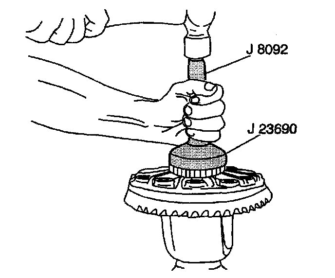 11. Place the proper shims on the differential side of the bearing hub (ring gear side) and drive the differential bearing onto the hub using the J8092 and J23690.