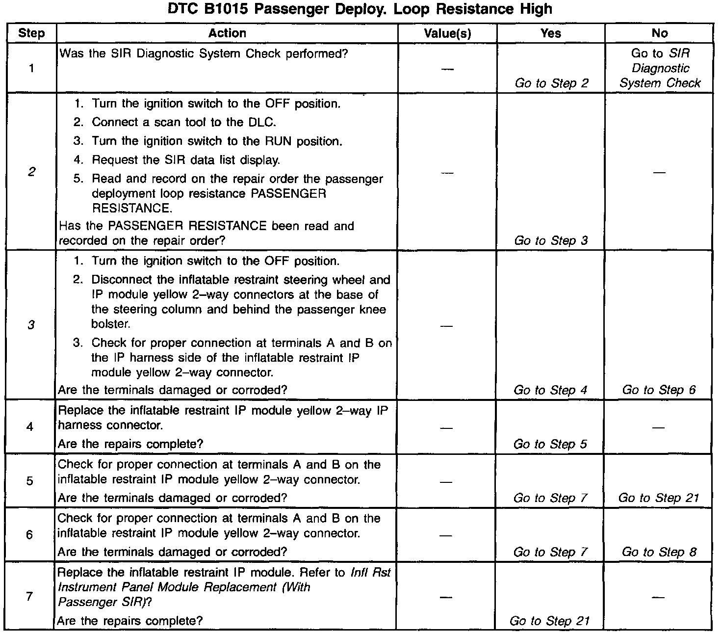 The numbers below refer to the step numbers on the diagnostic table: