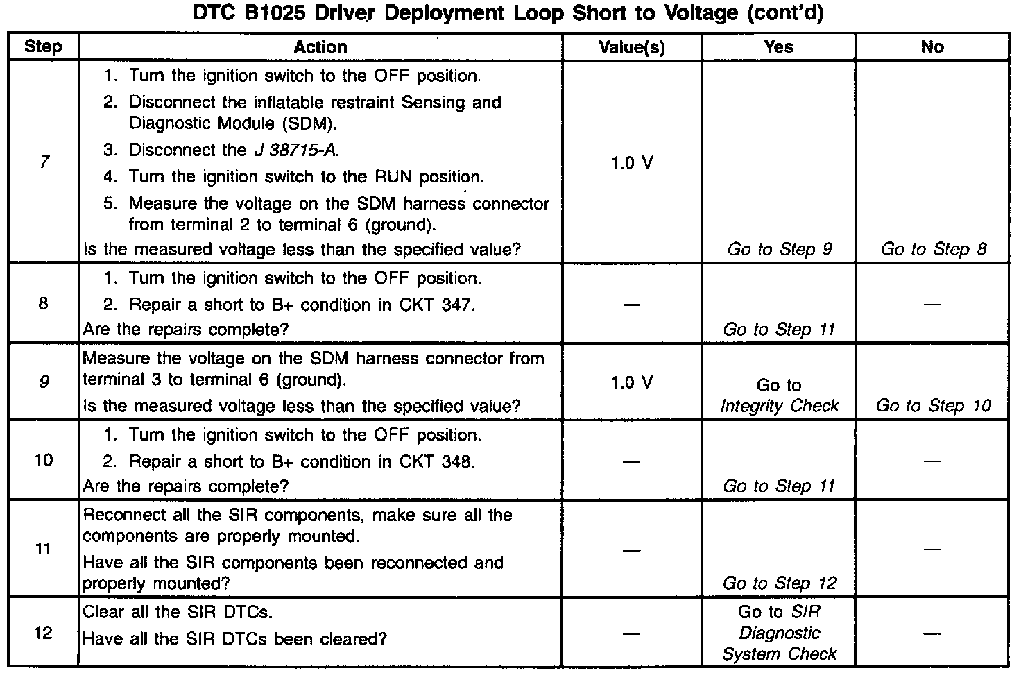 A short to B+ in the inflatable restraint steering wheel module circuit can cause an intermittent condition. Inspect CKT 347 and CKT 348 carefully for cut or chafed wires. The diagnostic table directs the technician to note the entry value of DRIVER SENSELO. Comparing the value of DRIVER SENSELO can be helpful in determining if an intermittent condition exists.