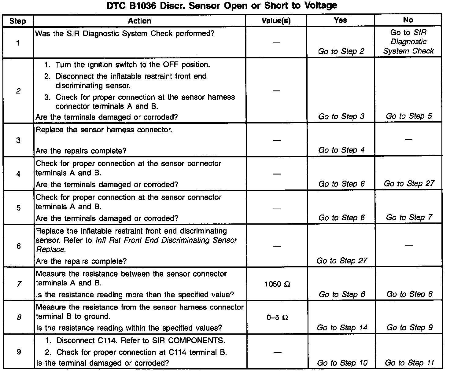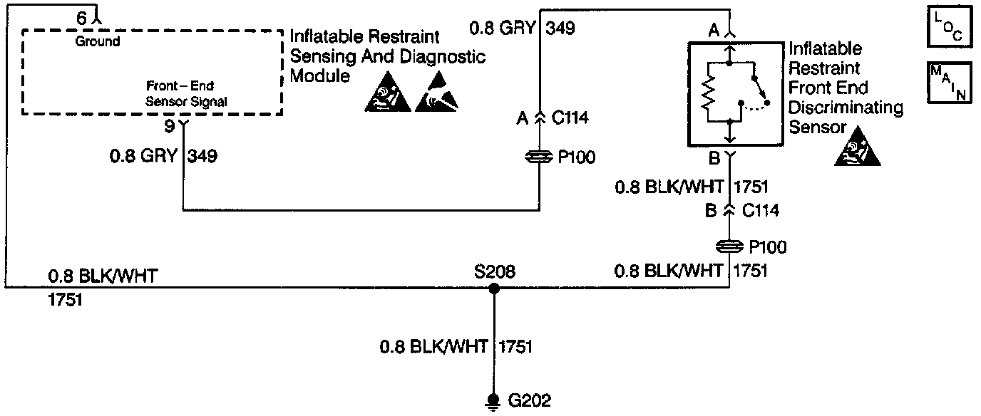 A broken or chafed wire in the inflatable restraint front end discriminating sensor circuit can cause an intermittent condition. Inspect CKT 349 and CKT 1751 carefully for cut or chafed wires. When measurements are requested in this table, use J 39200 Digital Multimeter with the correct terminal adapter from J 35616-A Connector Test Adapter Kit. When a check for proper connection is requested, refer to Intermittents and Poor Connections. Intermittent Problems