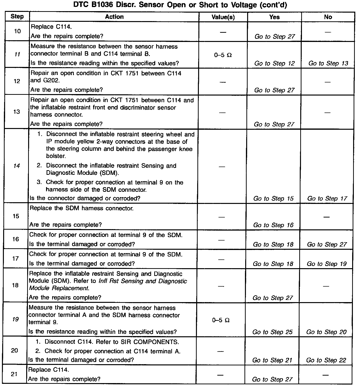 14. This test checks for proper contact or corrosion of the inflatable restraint Sensing and Diagnostic Module (SDM) connector.