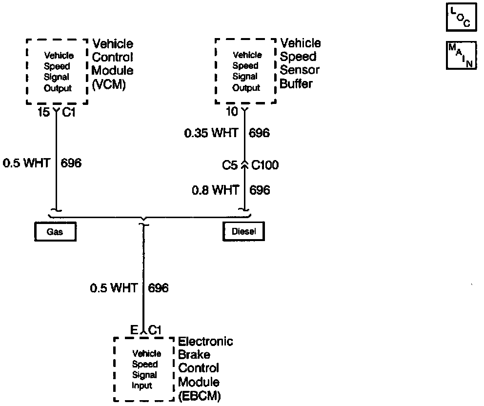 The Electronic Brake Control Module (EBCM) receives the rear wheel speed signal from the Vehicle Control Module (VCM) for gas engine vehicles or the Vehicle Speed Sensor Buffer for diesel engine vehicles. The rear wheel speed signal originates from the Vehicle Speed Sensor (Vehicle Speed Sensor (VSS)) which is connected to the VCM (gas) or the Vehicle Speed Sensor Buffer (diesel).