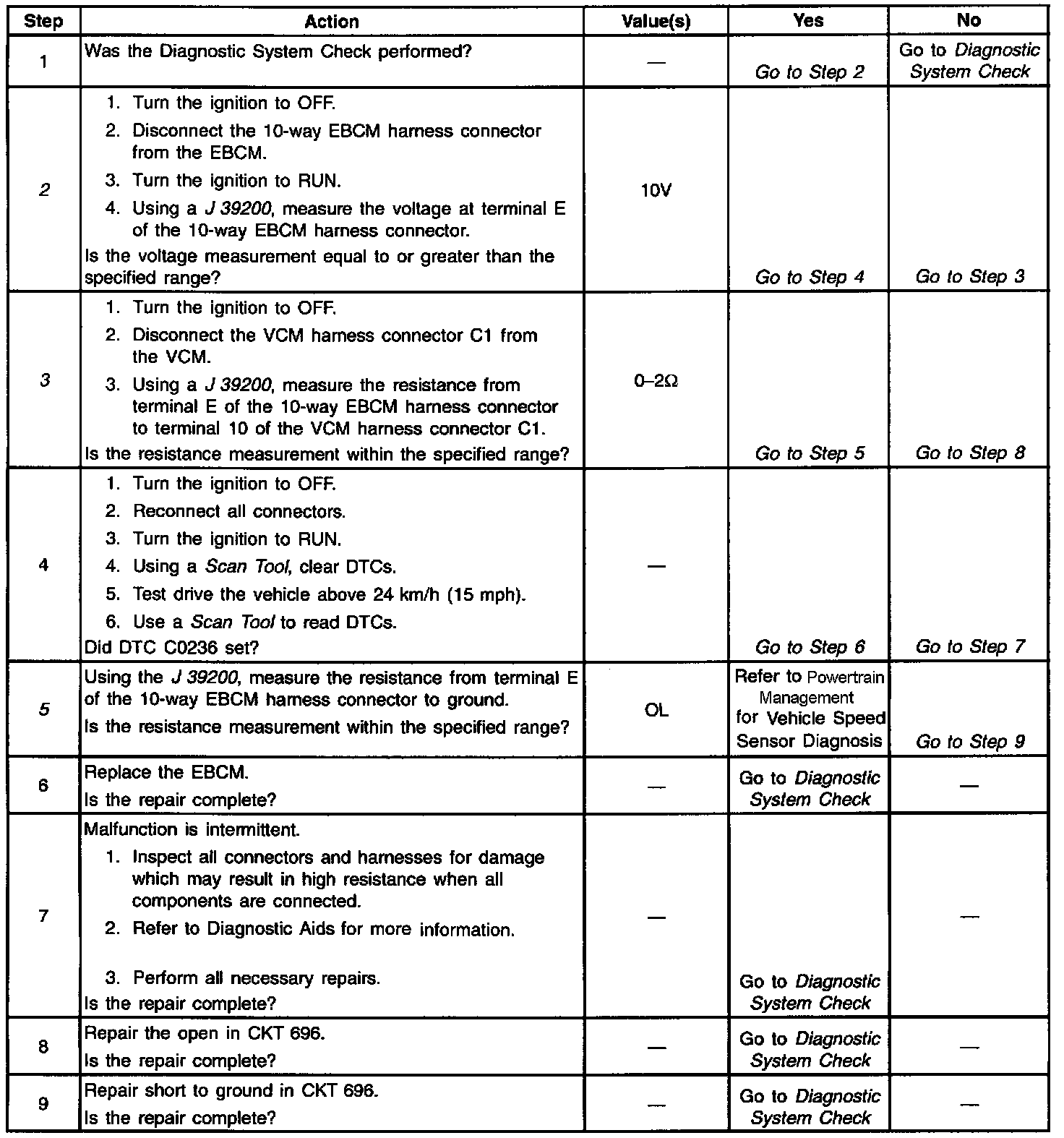 This malfunction can be caused by a malfunction in the EBCM, VCM (gas) Vehicle Speed Sensor Buffer (diesel), VSS or a fault in CKT 821, 822 or 1827.