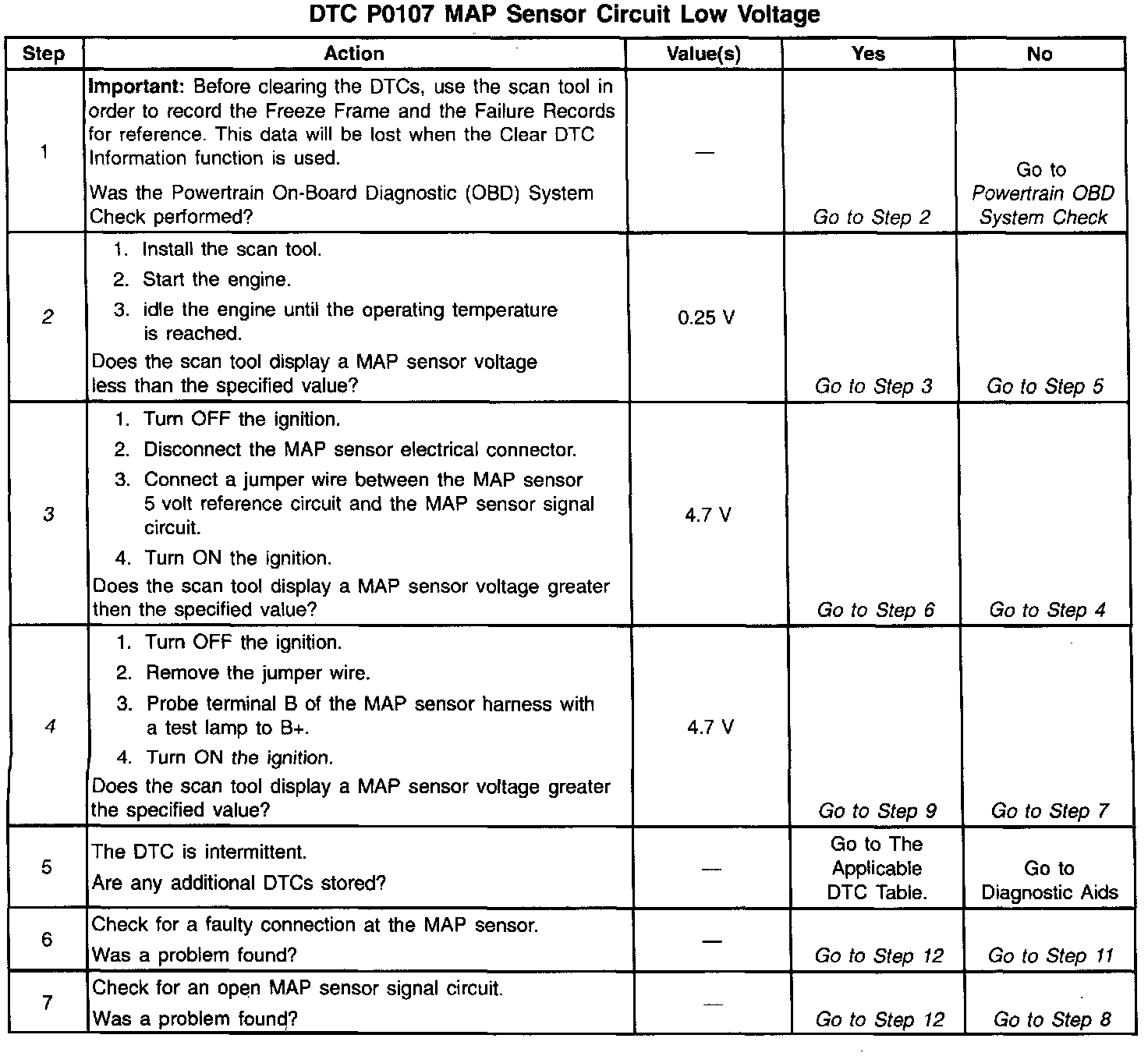 An intermittent open in the MAP sensor signal circuit or the 5 volt reference circuit will result in a DTC P1107.