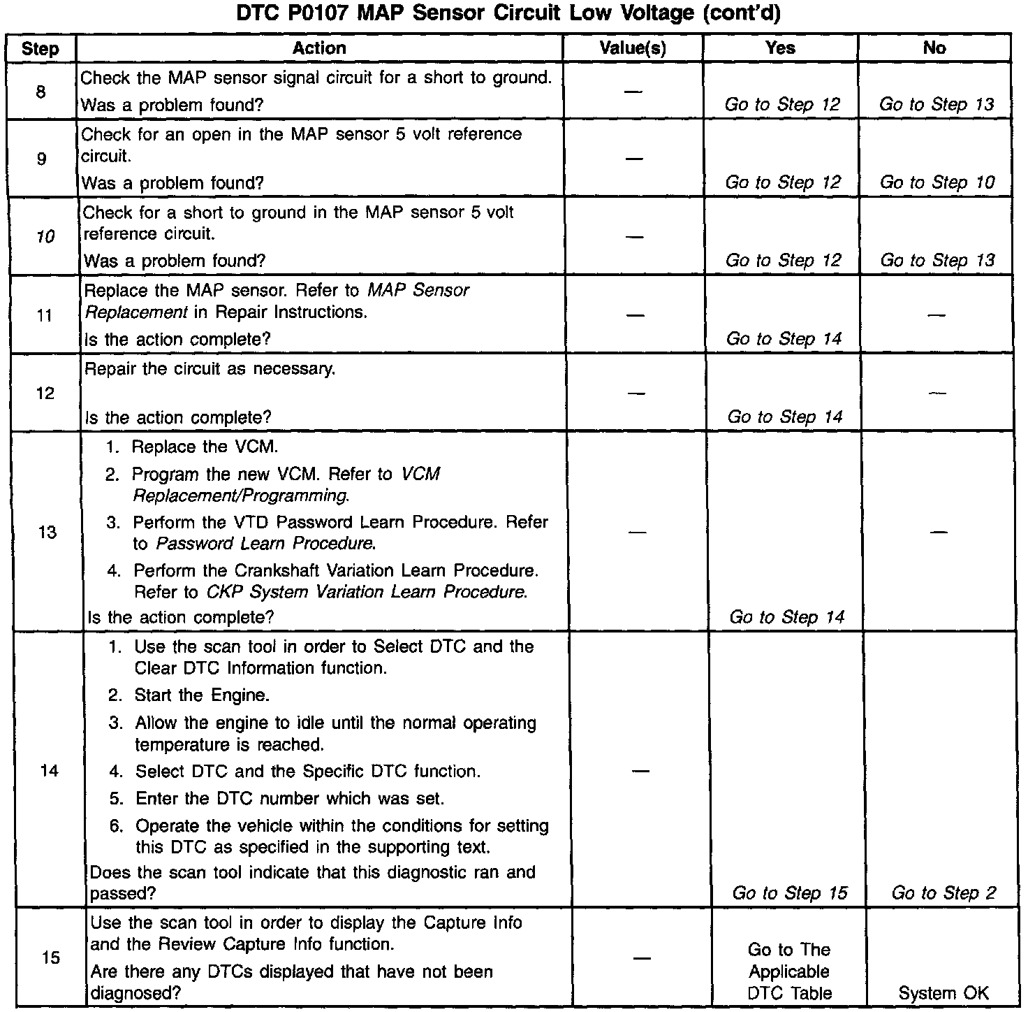 The numbers below refer to the step numbers on the diagnostic table.