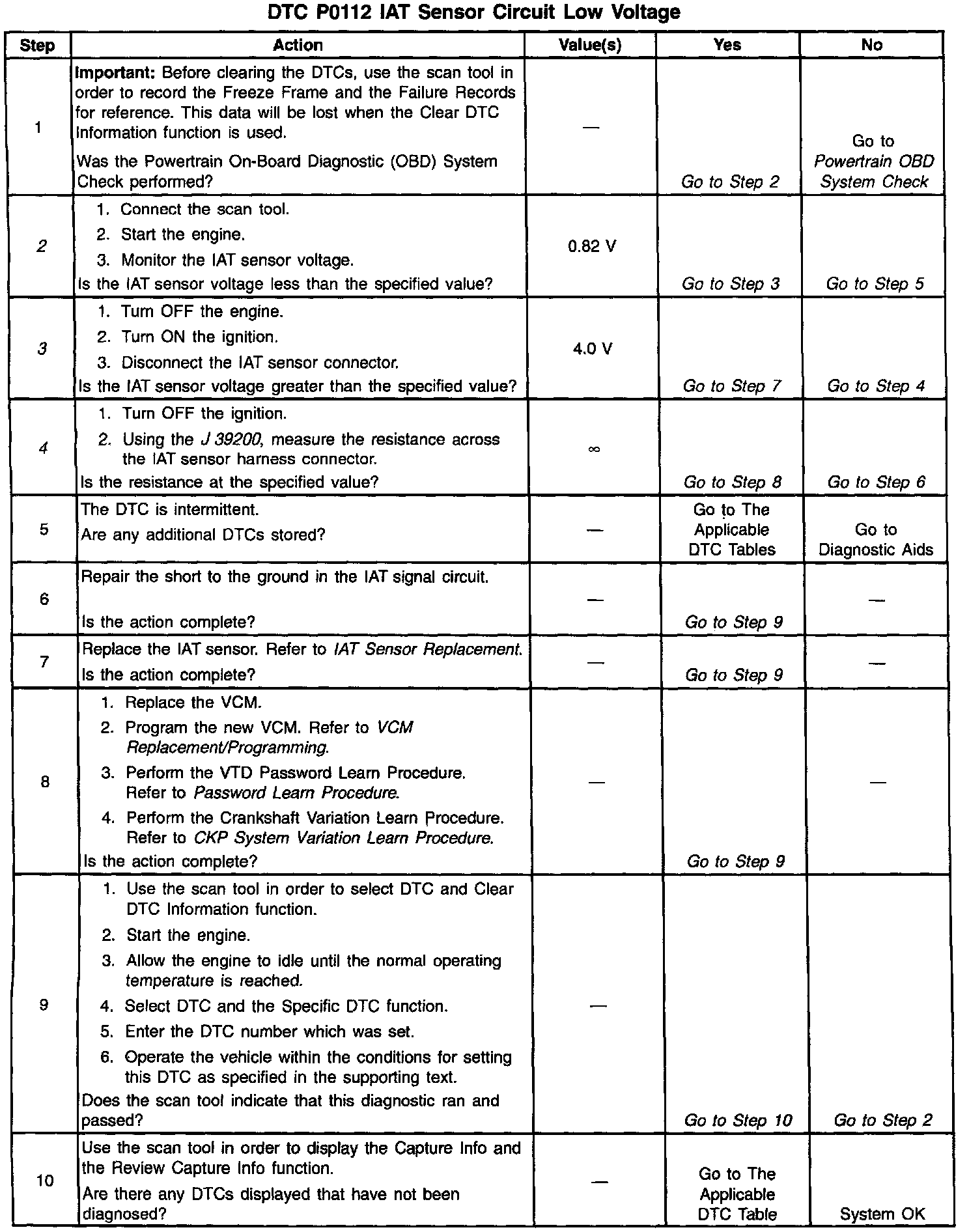 A scan tool indicates the temperature of the ambient air entering the throttle body. The air temperature should read very close to the temperature of the outside air. The air temperature should rise gradually as the engine warms up and the underhood temperature increases. If DTC P1112 is set, the problem is intermittent. Check for a short to ground in the IAT sensor signal circuit. This may be accomplished by moving the VCM harness at various locations and monitoring the IAT temperature or the IAT voltage on the scan tool. If the voltage varies, look for a short to ground in the area of the harness that caused the variance. Also, a sensor may become skewed or mis-scaled. The Temperature vs. Resistance Value Table will help to detect a skewed sensor. Refer to Specifications / Electrical / Temperature vs Resistance.