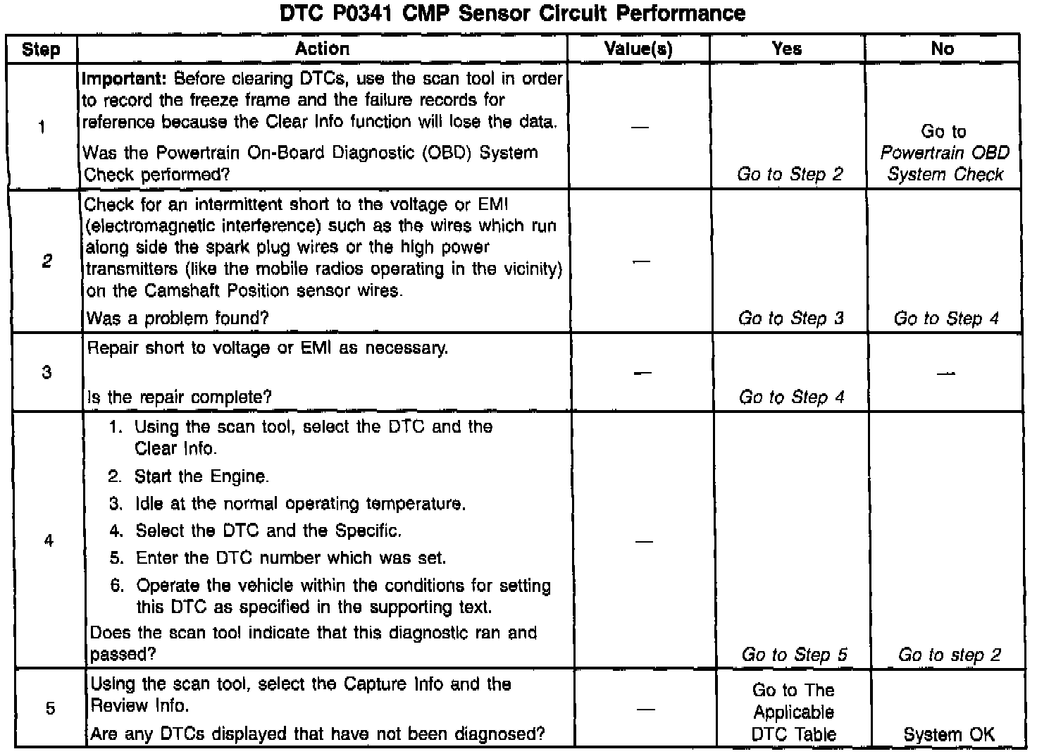 2. This step determines if DTC P0341 is the result of a hard failure or an intermittent condition. Determines, also, if voltage is available to the CMP through the VCM.
