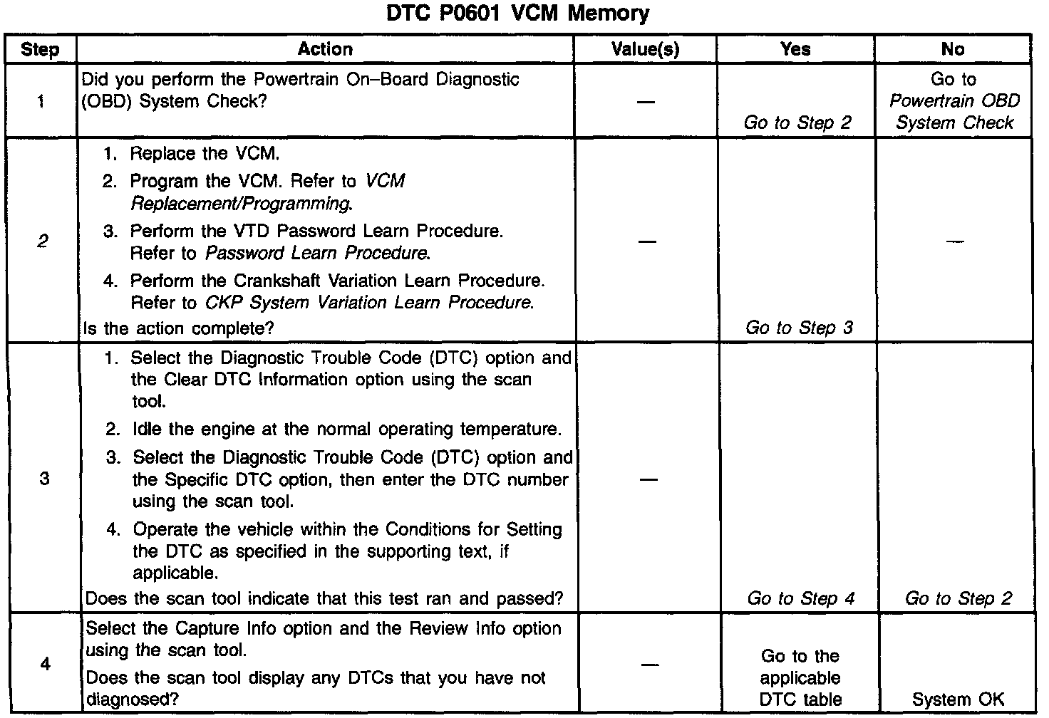 The VCM Program Memory contains data which is essential to running the engine and transmission. At powerup, the VCM continuously checks the integrity of this data. If the checksum of the Program Memory does not match a predetermined value, DTC P0601 sets.