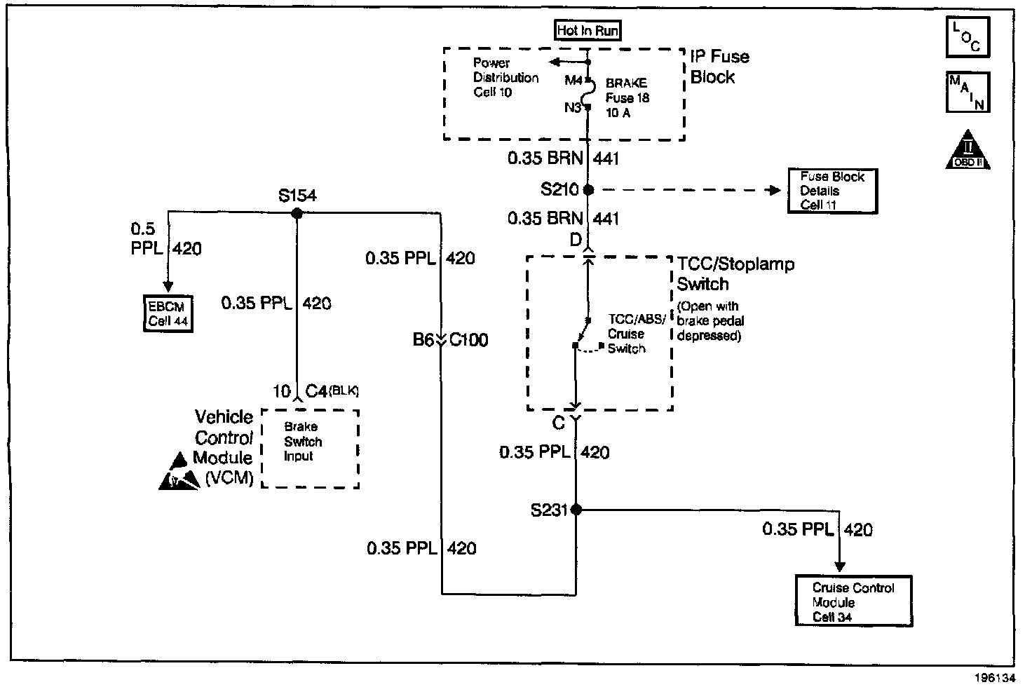 The brake switch indicates brake pedal status to the Vehicle Control Module (VCM). The brake switch is a normally-closed switch that supplies battery voltage on circuit 420 to the VCM. Applying the brake pedal opens the switch, interrupting voltage to the VCM. When the brake pedal is released, the VCM receives a constant voltage signal. If the VCM receives a zero voltage signal at the brake switch input, and the Torque Converter Clutch (TCC) is engaged, the VCM de-energizes the Torque Converter Clutch Solenoid Valve (TCC Sol. Valve). The VCM disregards the brake switch input for TCC scheduling if there is a brake switch circuit fault.